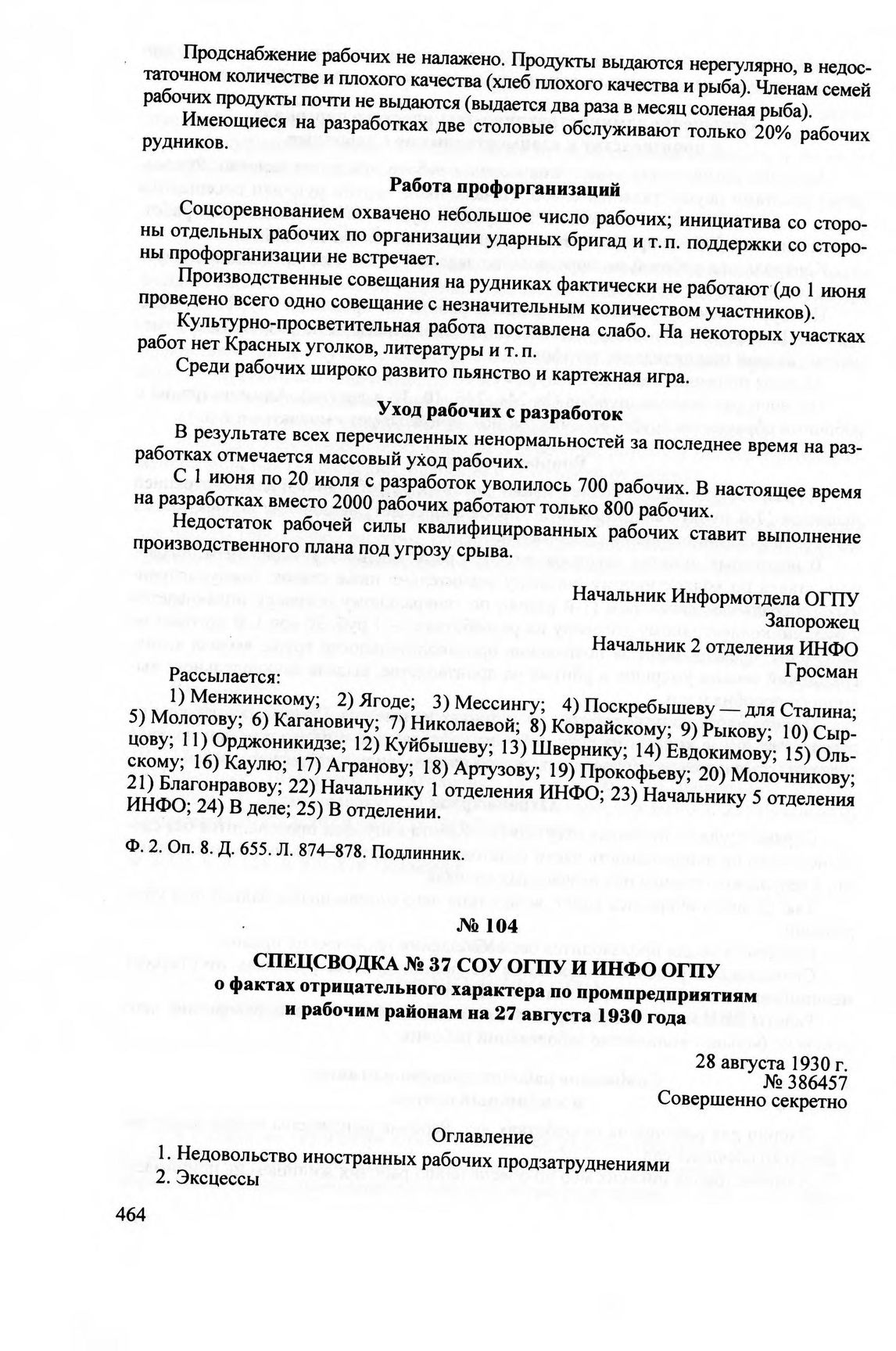 Спецсводка № 37 СОУ ОГПУ и ИНФО ОГПУ о фактах отрицательного характера по промпредприятиям и рабочим районам на 27 августа 1930 года. 28 августа 1930 г. // ЦА ФСБ РФ. Ф. 2. Оп. 8. Д. 655. Л. 909-916. Заверенная копия.