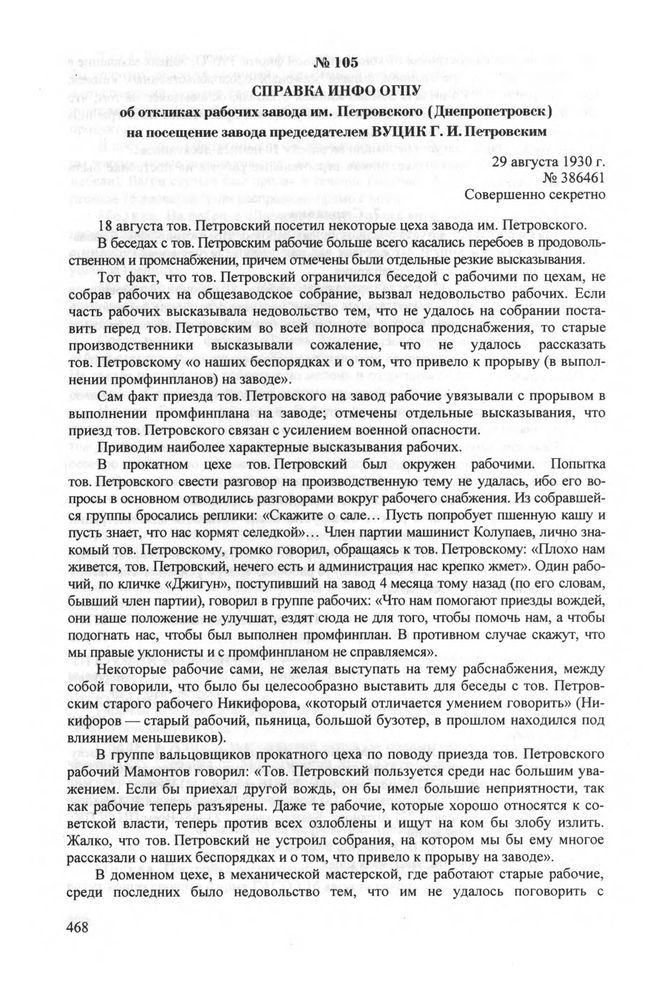 Справка ИНФО ОГПУ об откликах рабочих завода им. Петровского (Днепропетровск) на посещение завода председателем ВУЦИК Г. И. Петровским. 29 августа 1930 г. // ЦА ФСБ РФ. Ф. 2. Оп. 8. Д. 655. Л. 917-920. Подлинник.