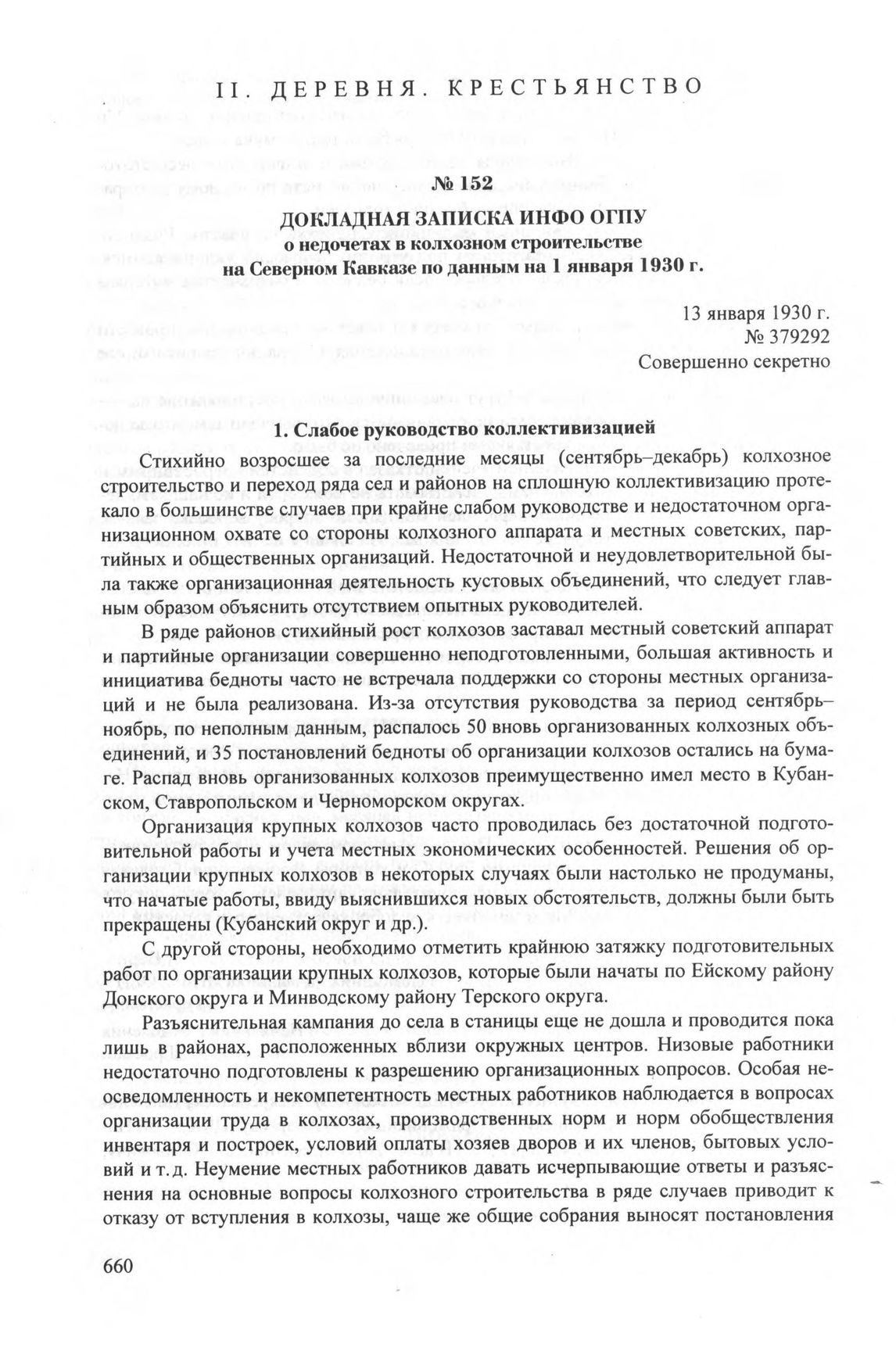 Докладная записка ИНФО ОГПУ о недочетах в колхозном строительстве на Северном Кавказе на 1 января 1930 г. 13 января 1930 г. // ЦА ФСБ РФ. Ф. 2. Оп. 8. Д. 677. Л. 76-95. Докладная записка— подлинник, приложения — заверенные копии.