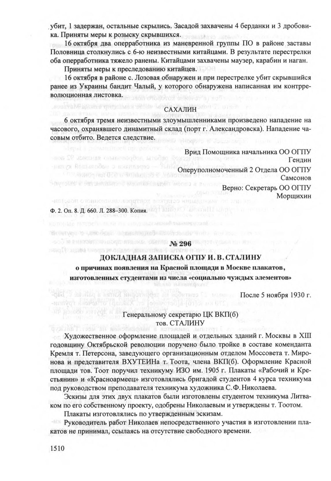 Докладная записка ОГПУ И.В. Сталину о причинах появления на Красной площади в Москве плакатов, изготовленных студентами из числа «социально чуждых элементов». После 5 ноября 1930 г.