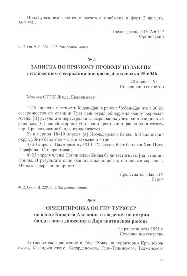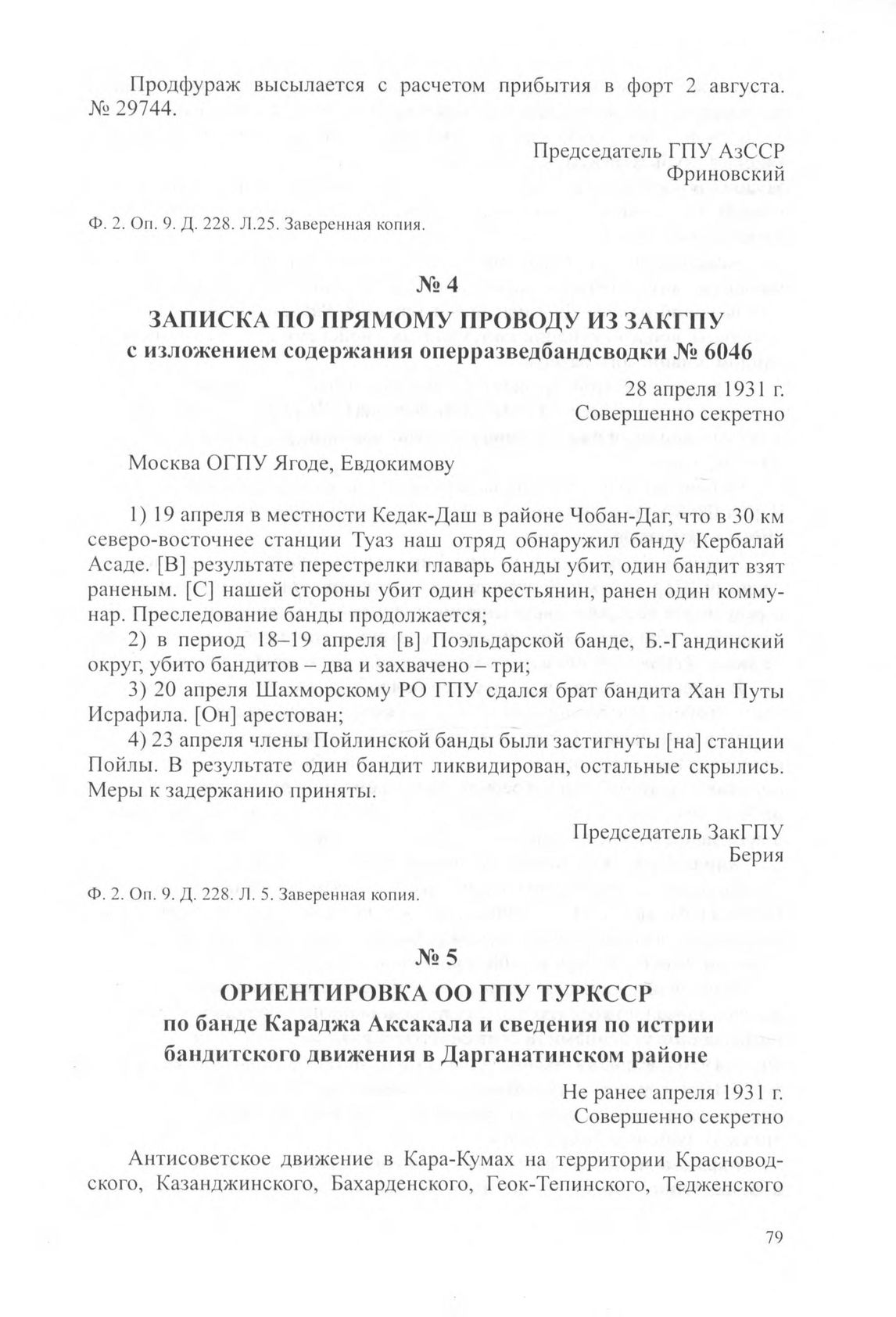 Ориентировка ОО ГПУ ТуркССР по банде Караджа Аксакала и сведения по истории бандитского движения в Дарганатинском районе. Не ранее апреля 1931 г. // ЦА ФСБ РФ. Ф. 2. Оп. 9. Д. 759. Л. 132. Копия.