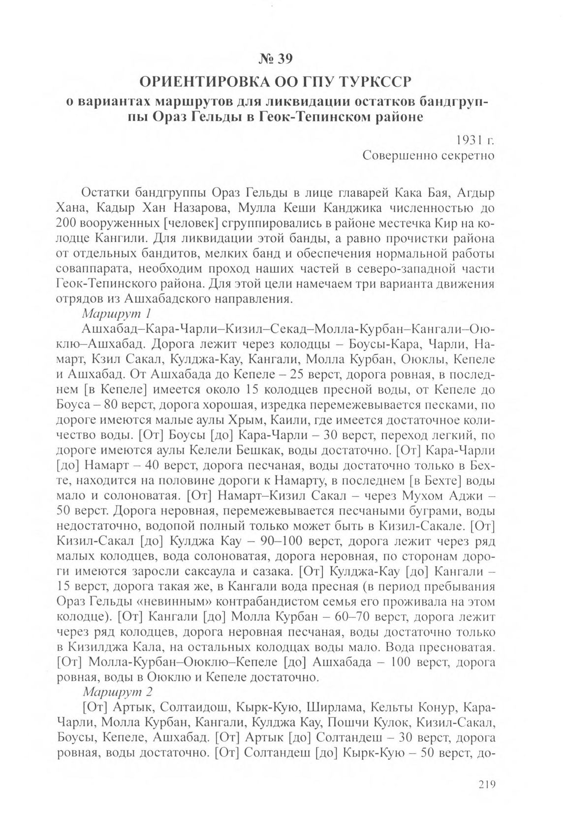 Ориентировка ОО ГПУ ТуркССР о вариантах маршрутов для ликвидации остатков бандгруппы Ораз Гельды в Геок-Тепинском районе. 1931 г.