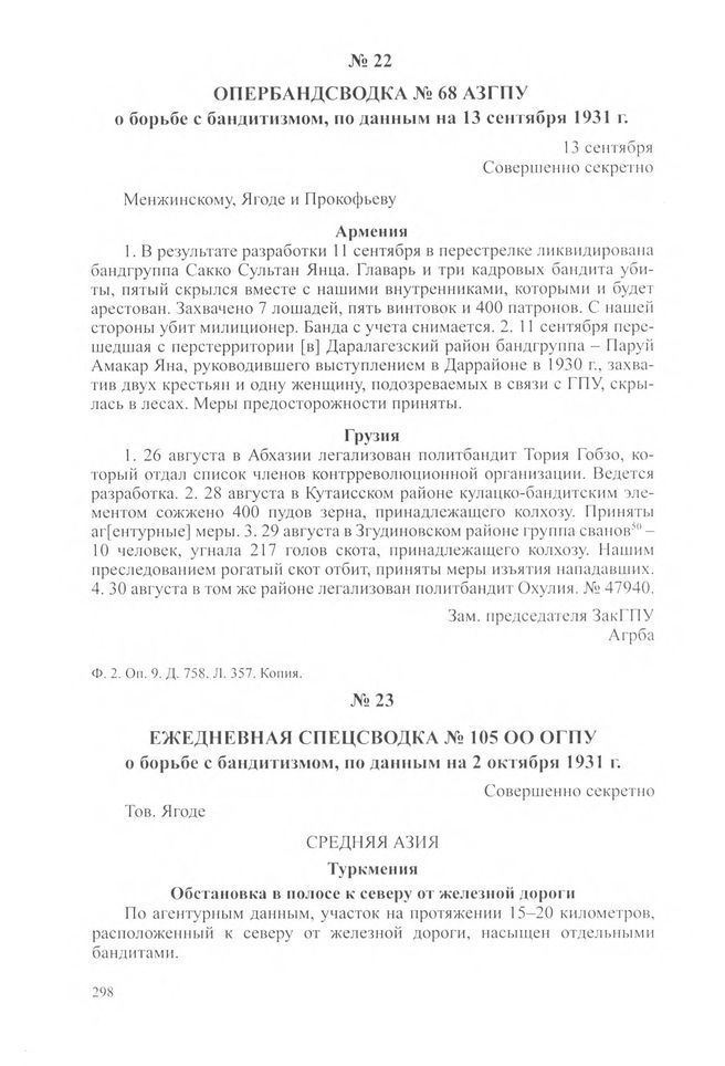 Ежедневная спецсводка № 105 ОО ОГПУ о борьбе с бандитизмом, по данным на 2 октября 1931 г. // ЦА ФСБ РФ. Ф. 2. Оп. 9. Д. 758. Л. 335-336. Подлинник.
