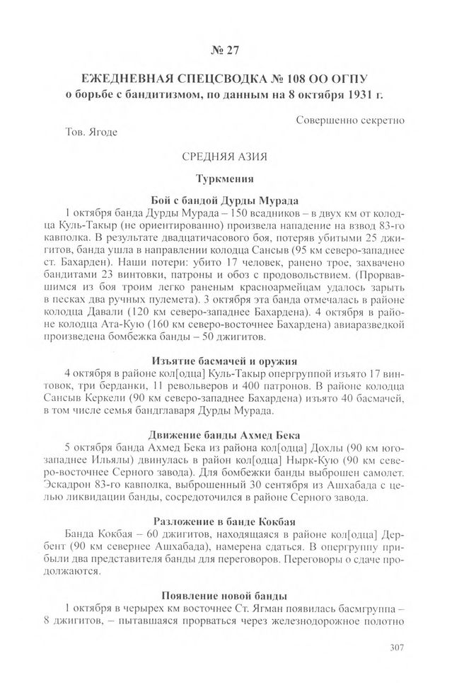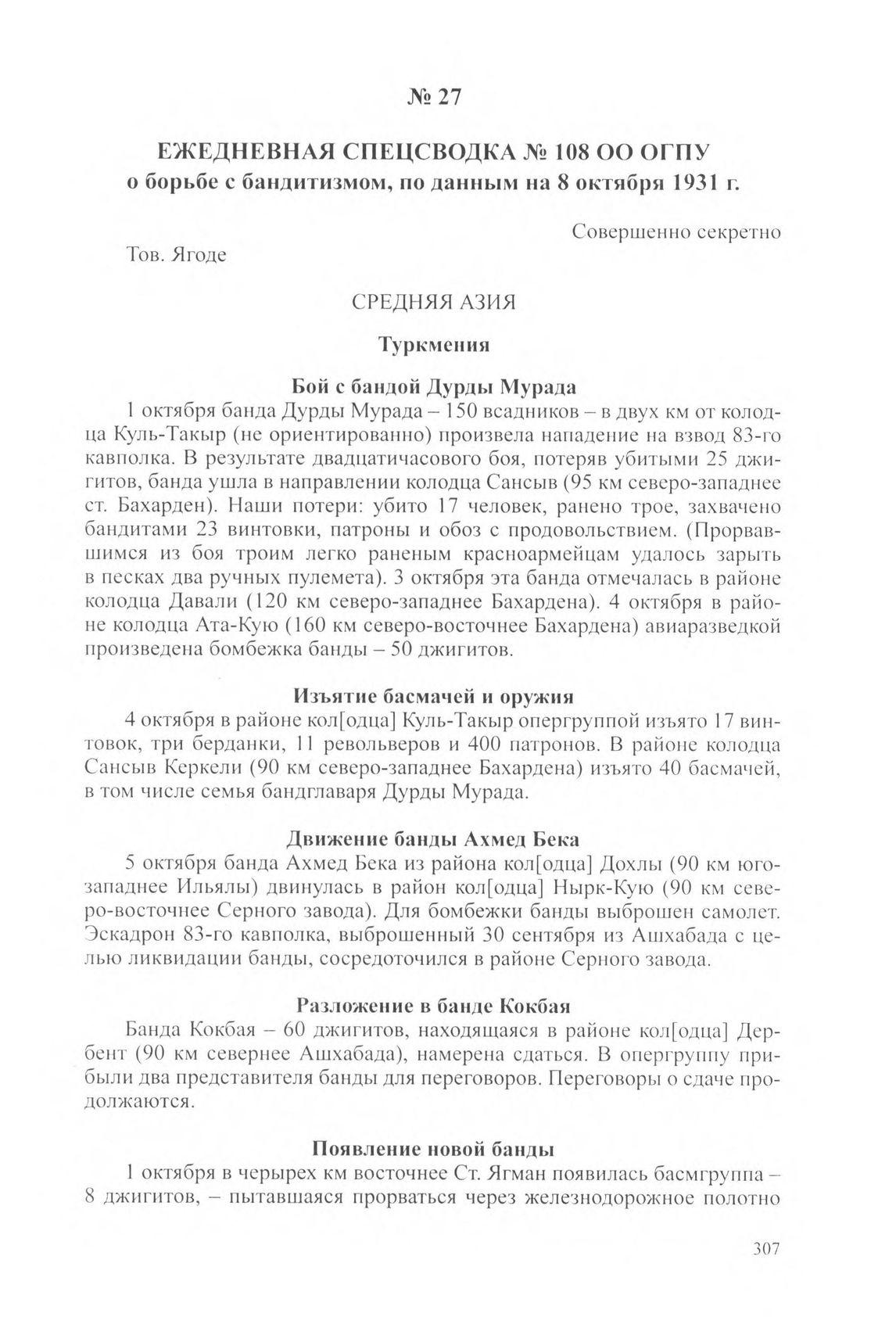 Ежедневная спецсводка № 108 ОО ОГПУ о борьбе с бандитизмом, по данным на 8 октября 1931 г. // ЦА ФСБ РФ. Ф. 2. Оп. 9. Д. 758. Л. 34-346. Заверенная копия.