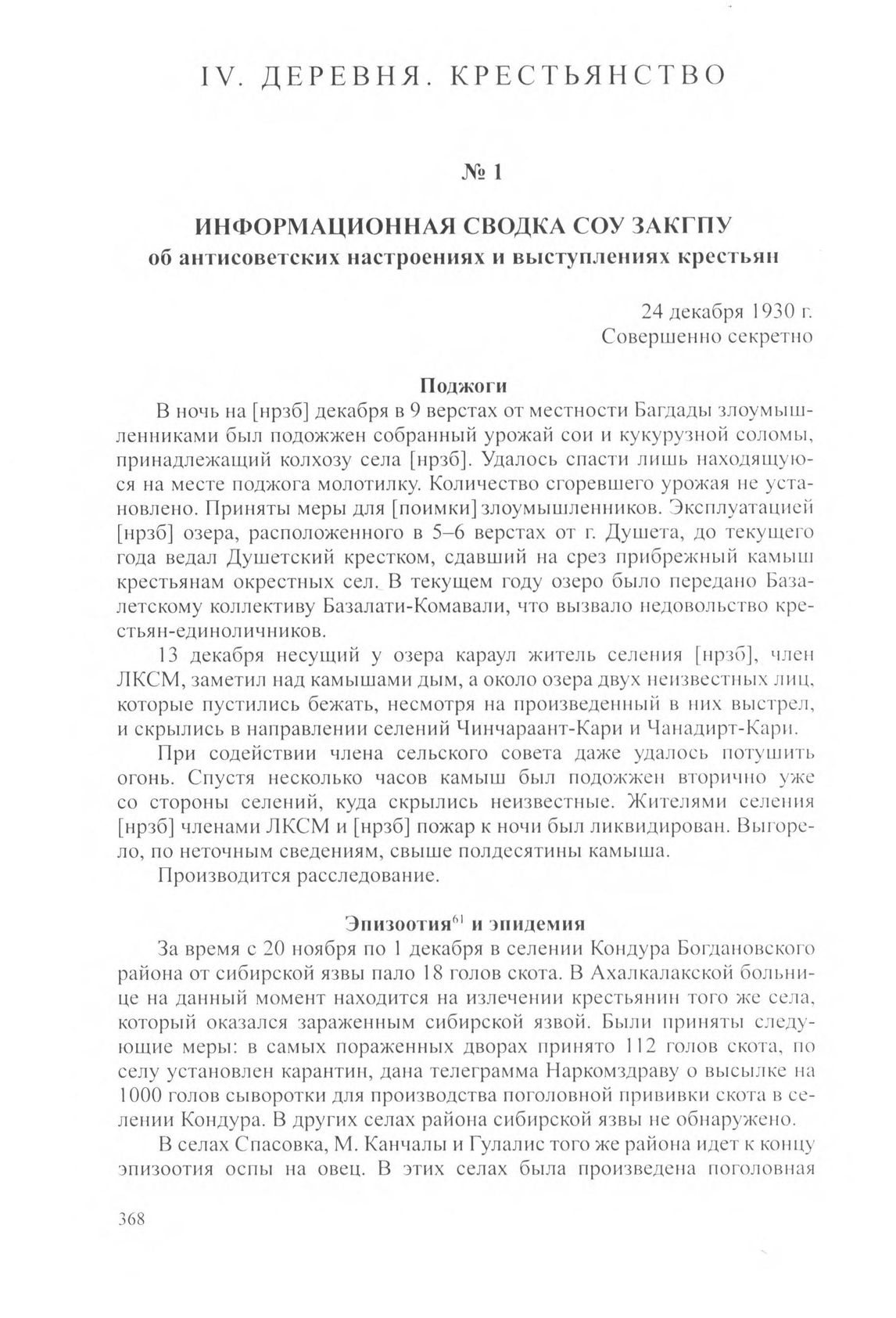 Информационная сводка СОУ ЗакГПУ об антисоветских настроениях и выступлениях крестьян. 24 декабря 1930 г. // ЦА ФСБ РФ. Ф. 2. Оп. 9. Д. 713. Л. 1-4. Копия.
