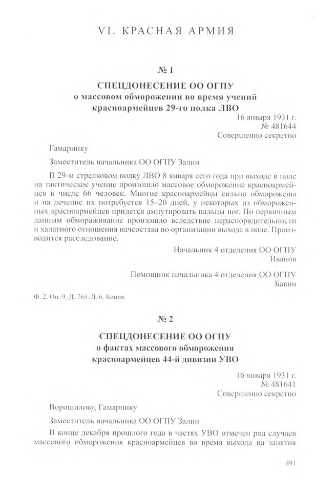 Спецдонесение ОО ОГПУ о фактах массового обморожения красноармейцев 44-й дивизии УВО. 16 января 1931 г. // ЦА ФСБ РФ. Ф. 2. Оп. 9. Д. 765. Л. 4-5. Копия.