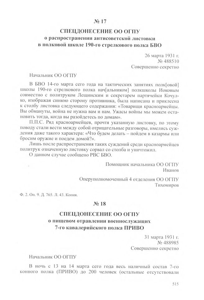 Спецдонесение ОО ОГПУ о пищевом отравлении военнослужащих 7-го кавалерийского полка ПриВО. 31 марта 1931 г. // ЦА ФСБ РФ. Ф. 2. Оп. 9. Д. 765. Л. 47. Копия.