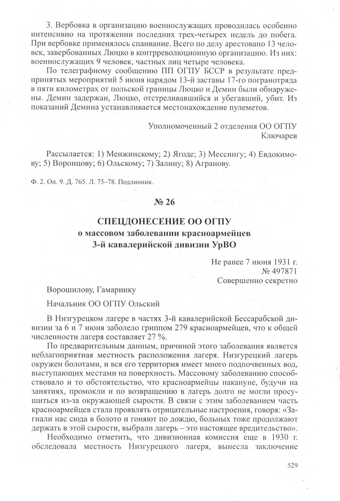 Спецдонесение ОО ОГПУ о массовом заболевании красноармейцев 3-й кавалерийской дивизии УрВО. Не ранее 7 июня 1931 г. // ЦА ФСБ РФ. Ф. 2. Оп. 9. Д. 765. Л. 80. Копия.