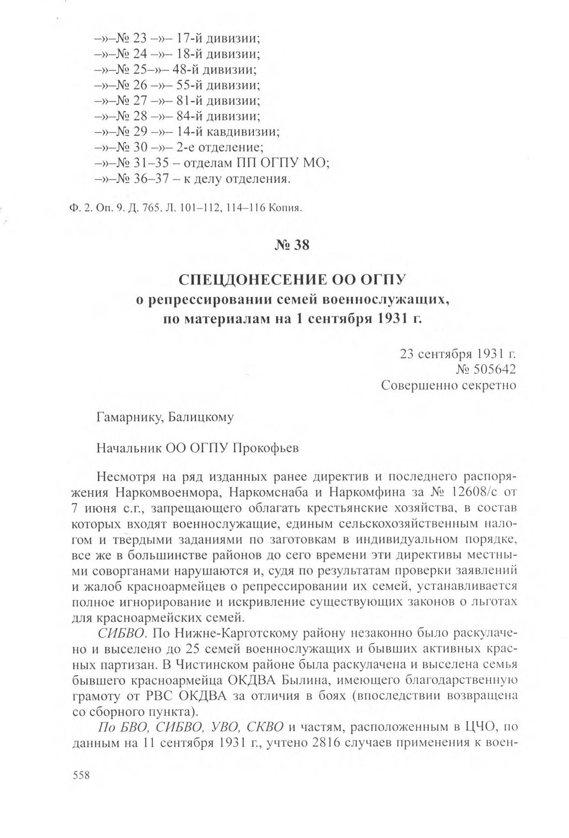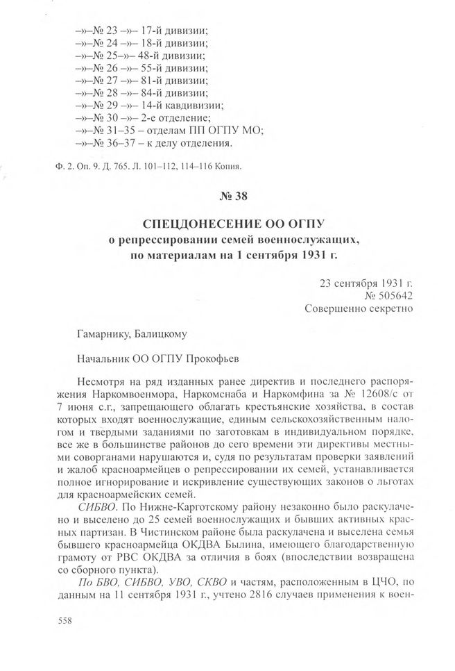 Спецдонесение ОО ОГПУ о репрессировании семей военнослужащих, по материалам на 1 сентября 1931 г. 23 сентября 1931 г. // ЦА ФСБ РФ. Ф. 2. Оп. 9. Д. 765. Л. 117-119. Подлинник.