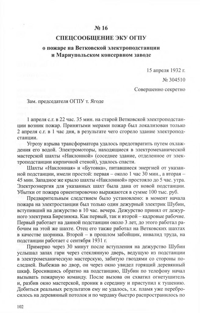Спецсообщение ЭКУ ОГПУ о пожаре на Ветковской электроподстанции и Мариупольском консервном заводе. 15 апреля 1932 г.