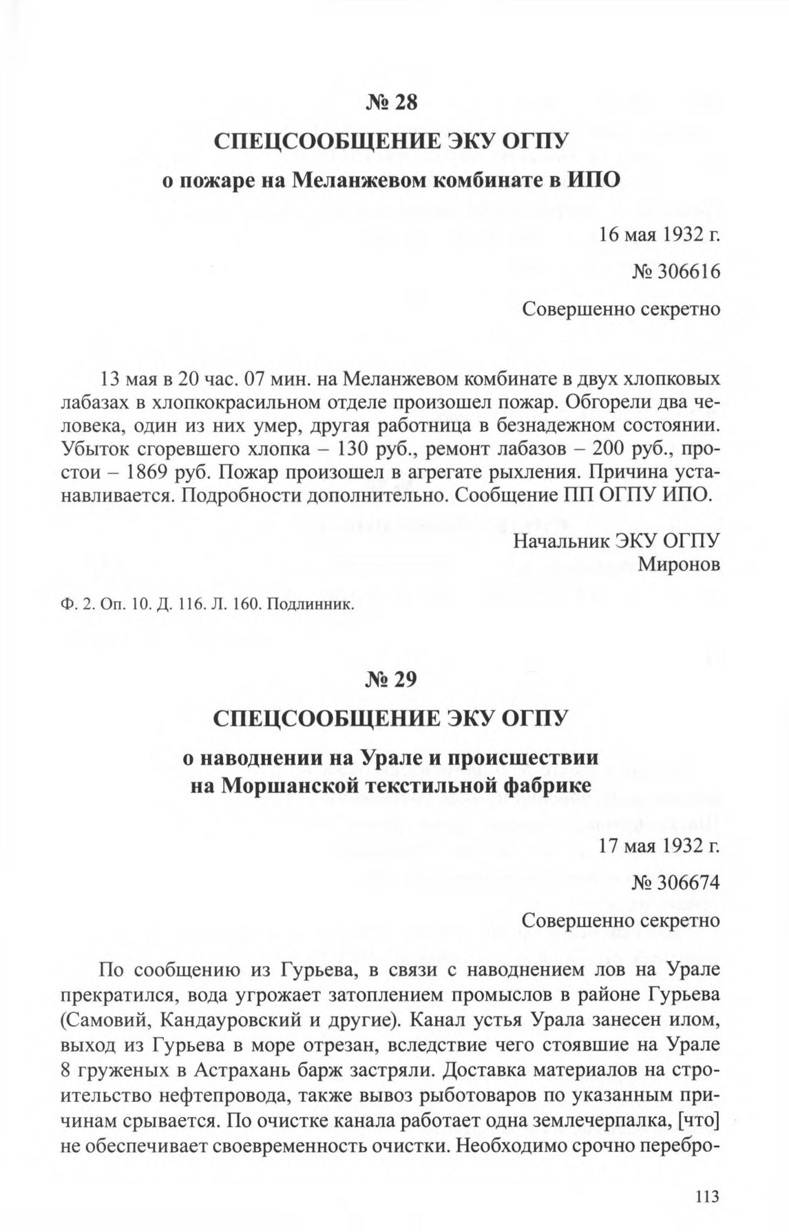 Спецсообщение ЭКУ ОГПУ о пожаре на Меланжевом комбинате в ИПО. 16 мая 1932 г.