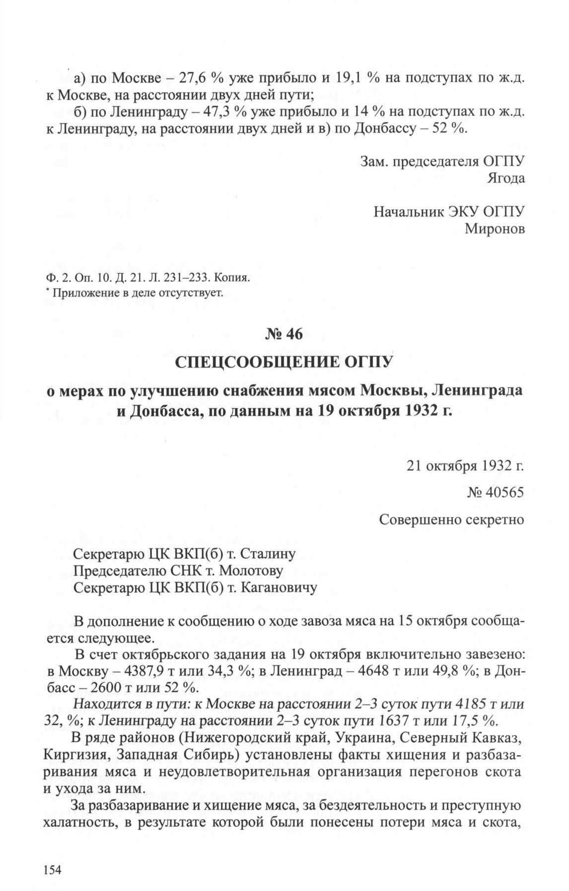 Спецсообщение ОГПУ о мерах по улучшению снабжения мясом Москвы, Ленинграда и Донбасса, по данным на 19 октября 1932 г. 21 октября 1932 г. // ЦА ФСБ РФ. Ф. 2. Оп. 11. Д. 21. Л. 217. Копия.