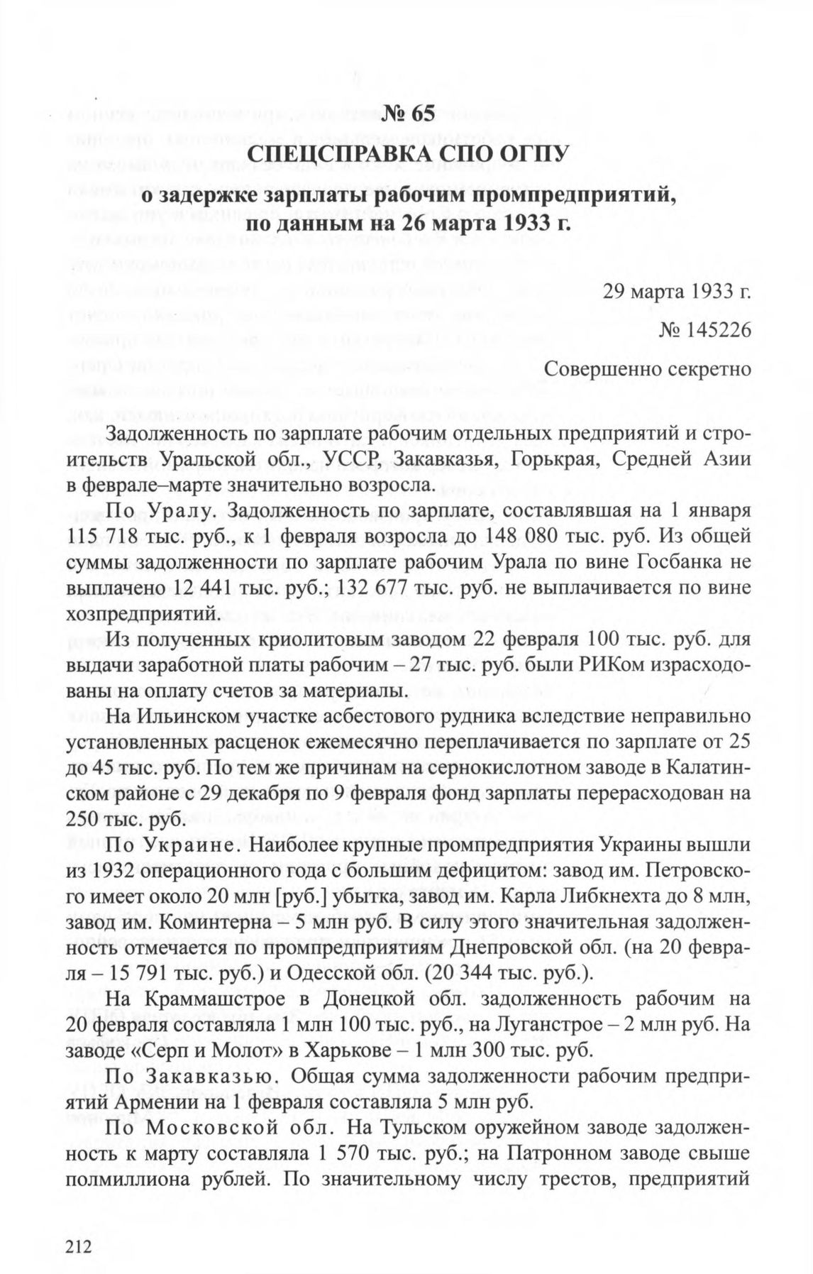 Спецсправка СПО ОГПУ о задержке зарплаты рабочим промпредприятий, по данным на 26 марта 1933 г. 29 марта 1933 г. // ЦА ФСБ РФ. Ф. 2. Оп. 11. Д. 34. Л. 144—147. Заверенная копия.