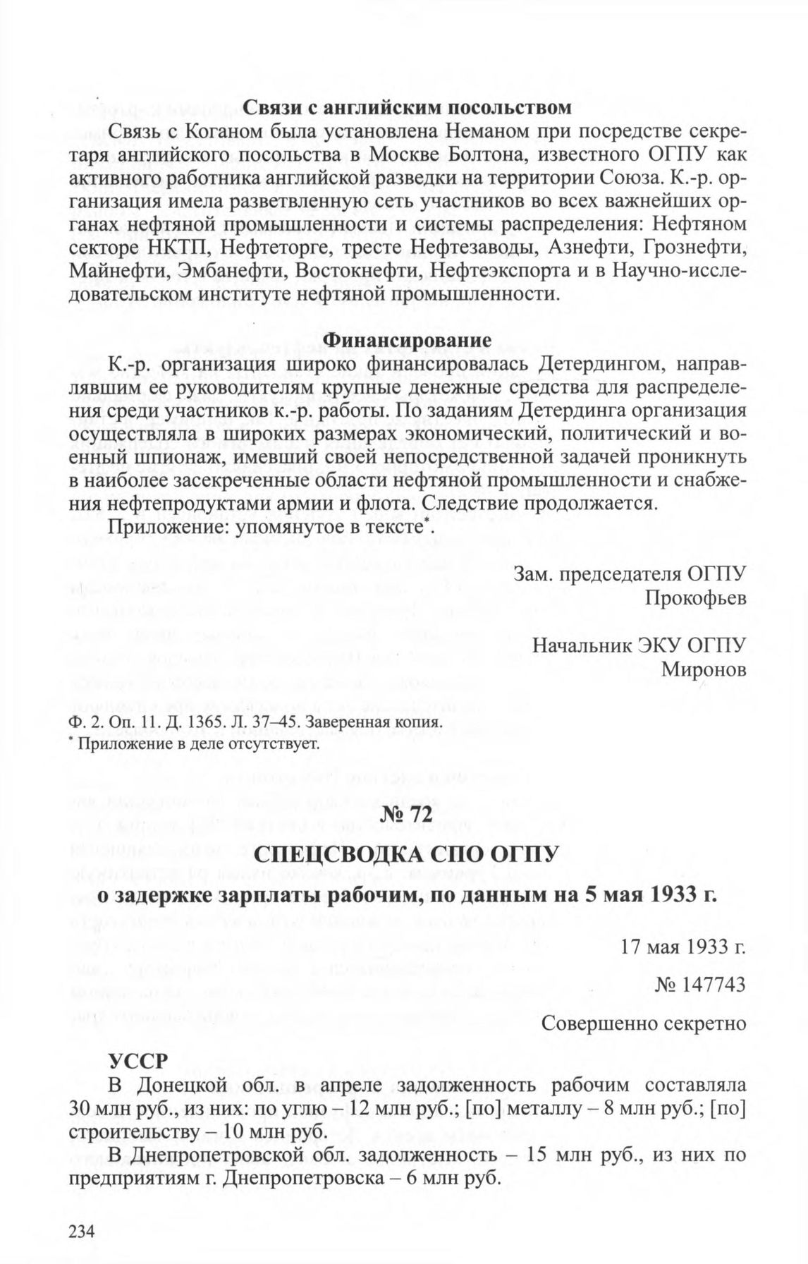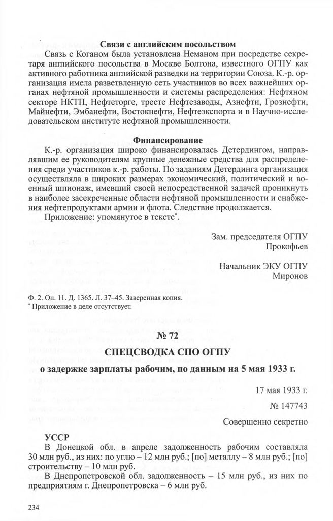Оперсводка СПО ОГПУ о задержке зарплаты рабочим, по данным на 5 мая 1933 г. 17 мая 1933 г. // ЦА ФСБ РФ. Ф. 2. Оп. 11. Д. 37. Л. 334-337. Заверенная копия.