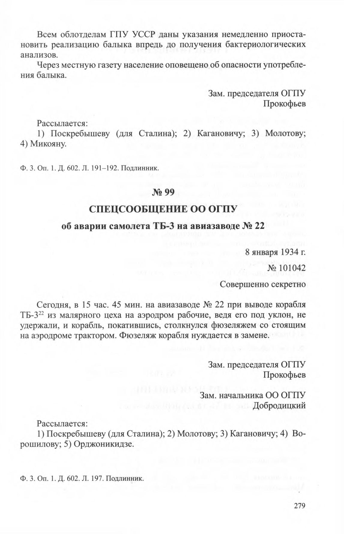 Спецсообщение ОО ОГПУ об аварии самолета ТБ-3 на авиазаводе № 22. 8 января 1934 г. // ЦА ФСБ РФ. Ф. 3. Oп. 1. Д. 602. Л. 197. Подлинник.