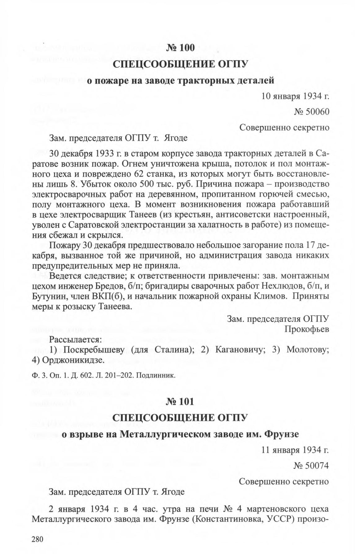 Спецсообщение ОГПУ о пожаре на заводе тракторных деталей. 10 января 1934 г. // ЦА ФСБ РФ. Ф. 3. Oп. 1. Д. 602. Л. 201-202. Подлинник.
