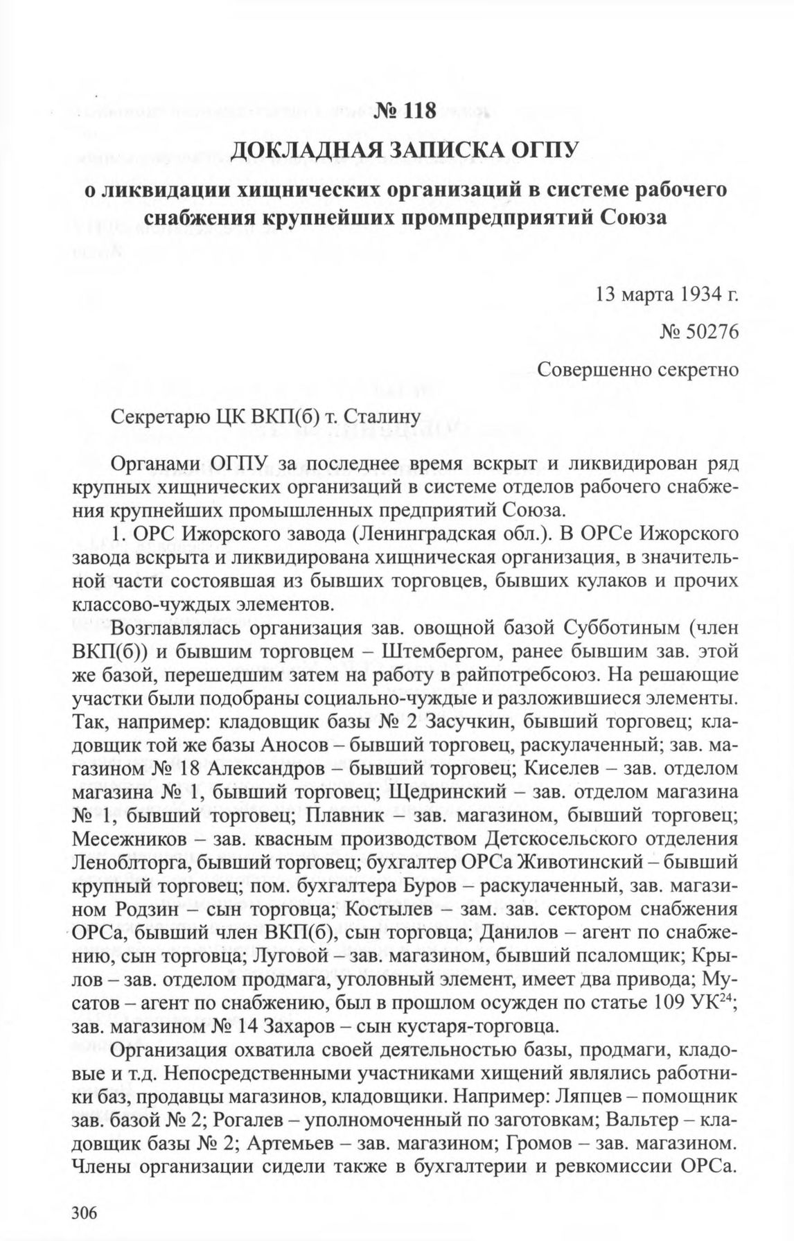 Докладная записка ОГПУ о ликвидации хищнических организаций в системе рабочего снабжения крупнейших промпредприятий Союза. 13 марта 1934 г. // ЦА ФСБ РФ. Ф. 3. Oп. 1. Д. 924. Л. 182-190. Заверенная копия.