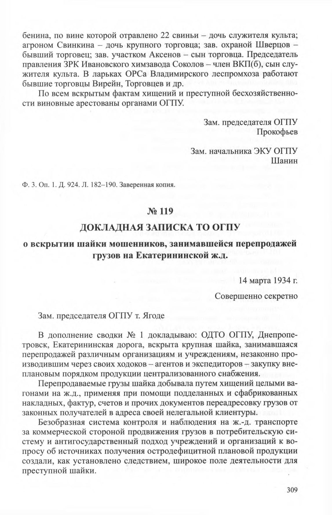 Докладная записка ТО ОГПУ о вскрытии шайки мошенников, занимавшейся перепродажей грузов на Екатерининской ж.д. 14 марта 1934 г. // ЦА ФСБ РФ. Ф. 3. Oп. 1. Д. 602. Л. 105-109. Копия.