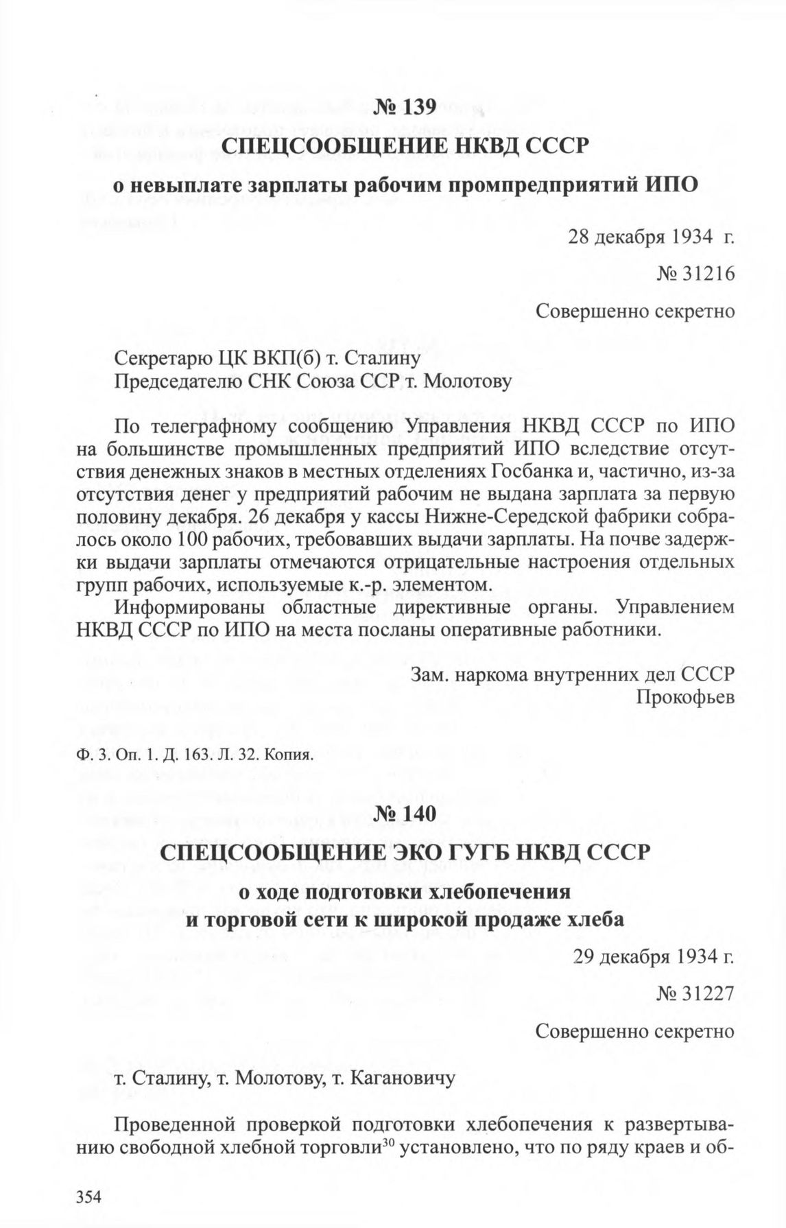 Спецсообщение ЭКО ГУГБ НКВД СССР о ходе подготовки хлебопечения и торговой сети к широкой продаже хлеба. 29 декабря 1934 г. // ЦА ФСБ РФ. Ф. 3. Oп. 1. Д. 163. Л. 7-17. Копия.