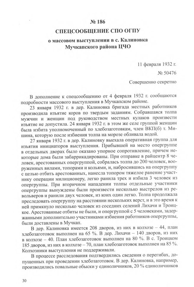 Спецсообщение СПО ОГПУ о массовом выступлении в с. Калиновка Мучкапского района ЦЧО. 11 февраля 1932 г.