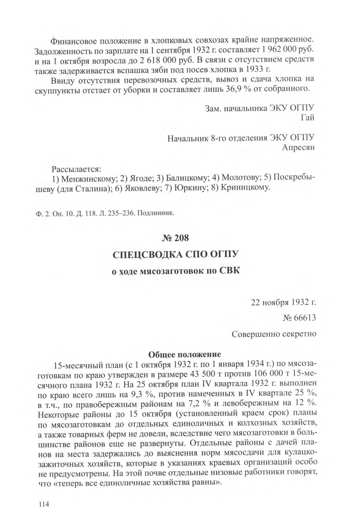Спецсводка СПО ОГПУ о ходе мясозаготовок по СВК. 22 ноября 1932 г. // ЦА ФСБ РФ. Ф. 2. Оп. 10. Д. 514. Л. 249-253. Заверенная копия.