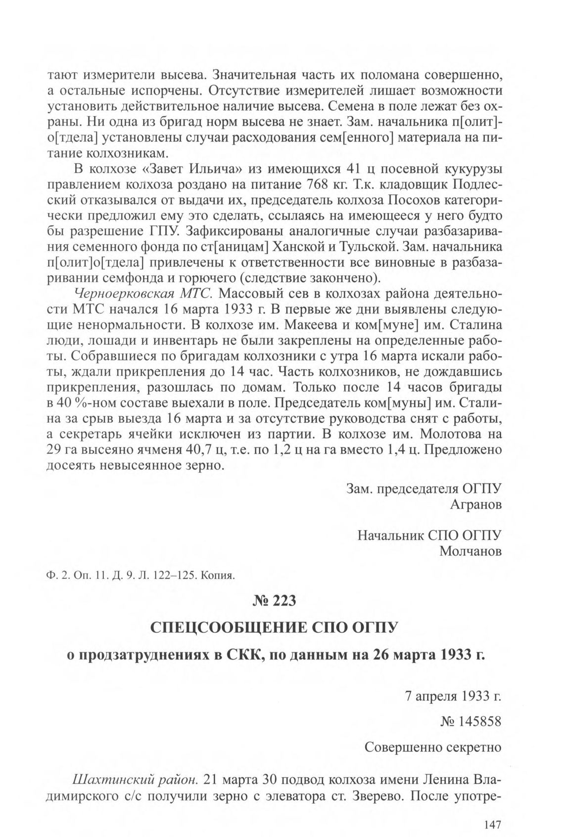 Спецсообщение СПО ОГПУ о продзатруднениях в СКК, по данным на 26 марта 1933 г. 7 апреля 1933 г. // ЦА ФСБ РФ. Ф. 2. Oп. 11. Д. 56. Л. 38-39. Заверенная копия.