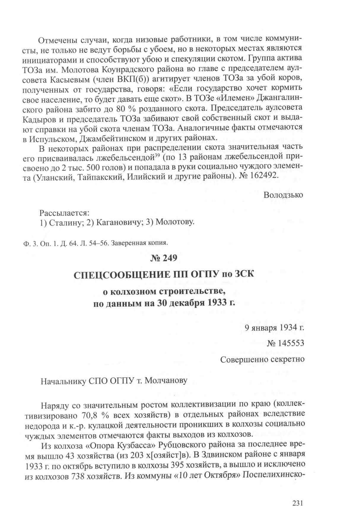 Спецсообщение ПП ОГПУ по ЗСК о колхозном строительстве, по данным на 30 декабря 1933 г. 9 января 1934 г.