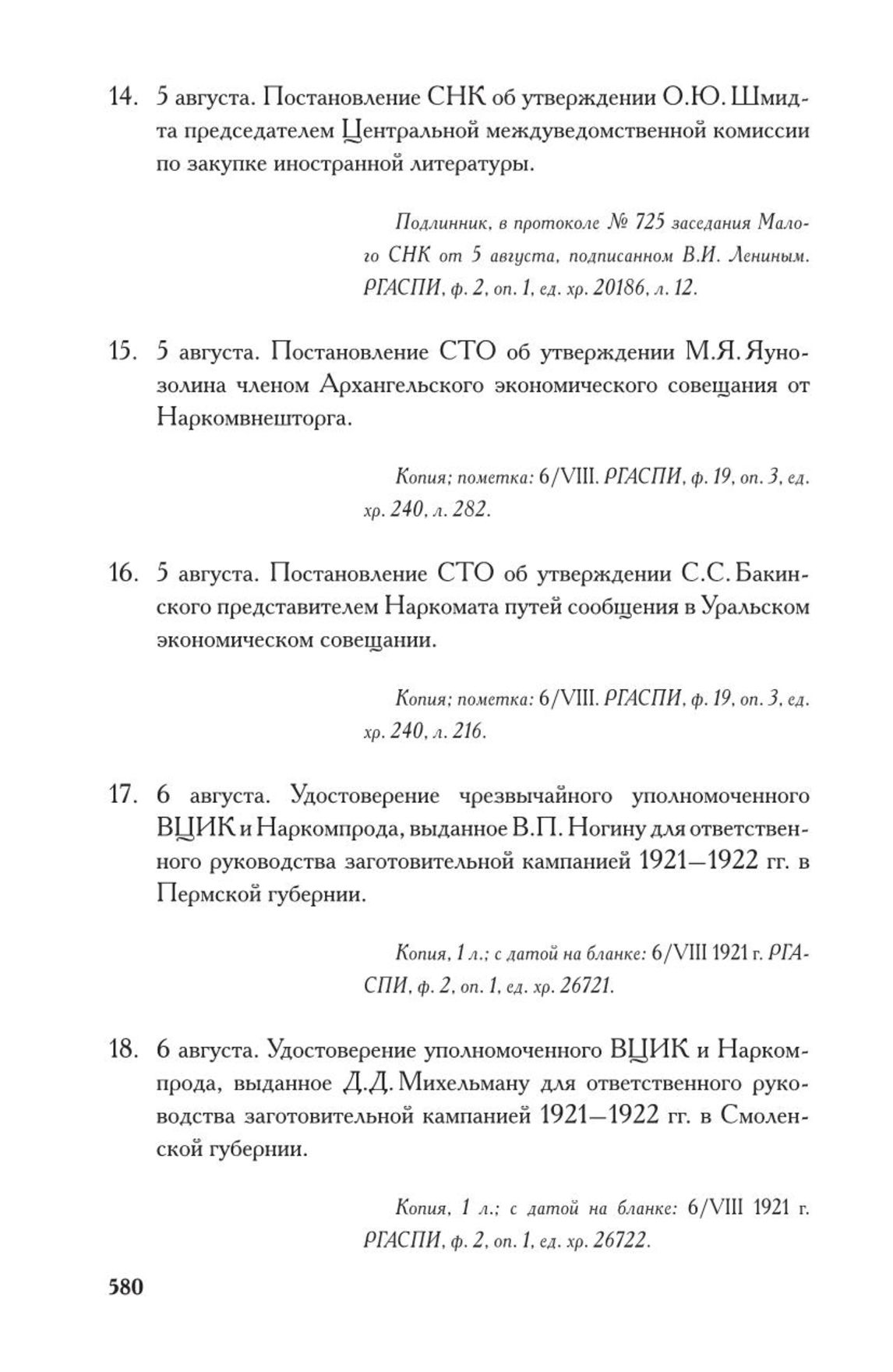 Удостоверение чрезвычайного уполномоченного ВЦИК и Наркомпрода, выданное В.П. Ногину для ответственного руководства заготовительной кампанией 1921–1922 гг. в Пермской губернии. 6 августа // Копия, 1 л.; с датой на бланке: 6/VIII 1921 г. РГАСПИ, ф. 2, оп. 1, ед. хр. 26721.