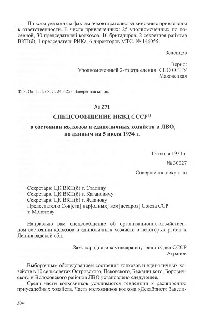 Спецсообщение НКВД СССР о состоянии колхозов и единоличных хозяйств в ЛВО, по данным на 5 июля 1934 г. 13 июля 1934 г. // ЦА ФСБ РФ. Ф. 3. Oп. 1. Д. 61. Л. 272-281. Заверенная копия.