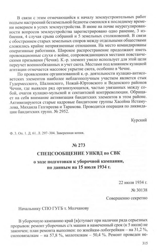 Спецсообщение УНКВД по СВК о ходе подготовки к уборочной кампании, по данным на 15 июля 1934 г. 22 июля 1934 г. // ЦА ФСБ РФ. Ф. 3. Oп. 1. Д. 61. Л. 413-417. Заверенная копия.