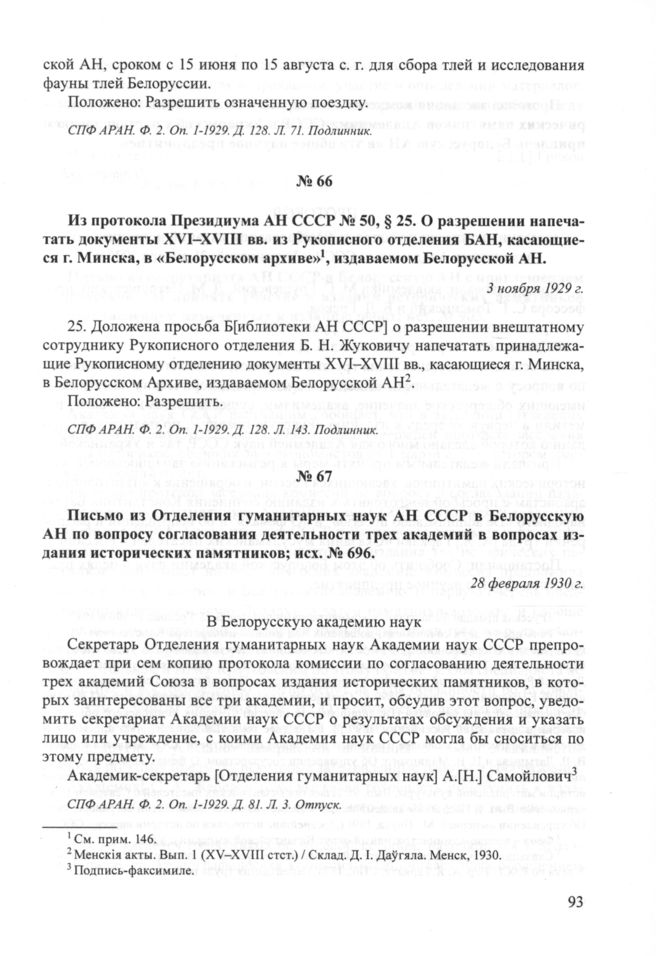 Из протокола Президиума АН СССР № 50, § 25. О разрешении напечатать документы XVI-XVIII вв. из Рукописного отделения БАН, касающиеся г. Минска, в «Белорусском архиве», издаваемом Белорусской АН. 3 ноября 1929 г. // СПФ АРАН. Ф. 2. Oп. 1-1929. Д. 128. Л. 143. Подлинник.