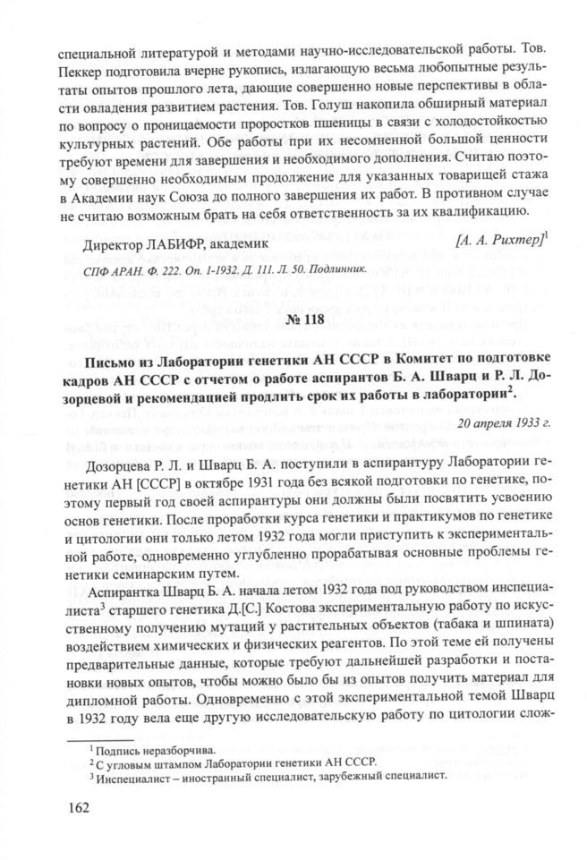Письмо из Лаборатории генетики АН СССР в Комитет по подготовке кадров АН СССР с отчетом о работе аспирантов Б.А. Шварц и Р.Л. Дозорцевой и рекомендацией продлить срок их работы в лаборатории. 20 апреля 1933 г. // СПФ АРАН. Ф. 222. Oп. 1-1932. Д. 111. Л. 51-51 об. Подлинник. Автограф .
