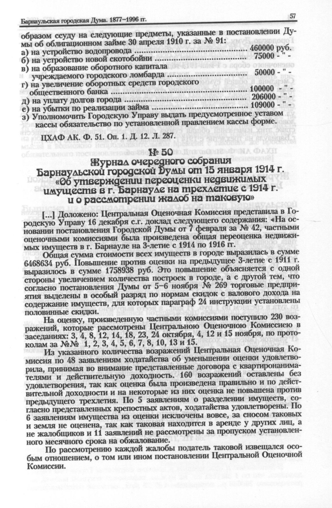 Журнал очередного собрания Барнаульской городской Думы от 15 января 1914 г. «Об утверждении переоценки недвижимых имуществ в г. Барнауле на трехлетие с 1914 г. и о рассмотрении жалоб на таковую»