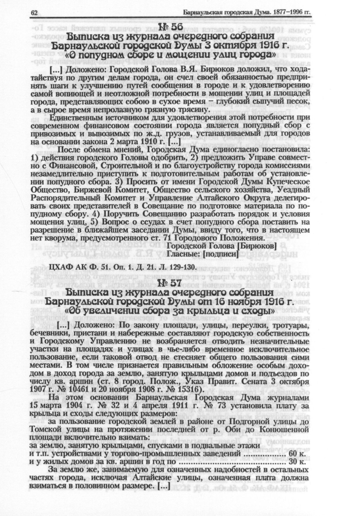 Выписка из журнала очередного собрания Барнаульской городской Думы 3 октября 1916 г. «О попудном сборе и мощении улиц города» // ЦХАФ АК. Ф. 51. Oп. 1. Д. 21. Л. 129-130.