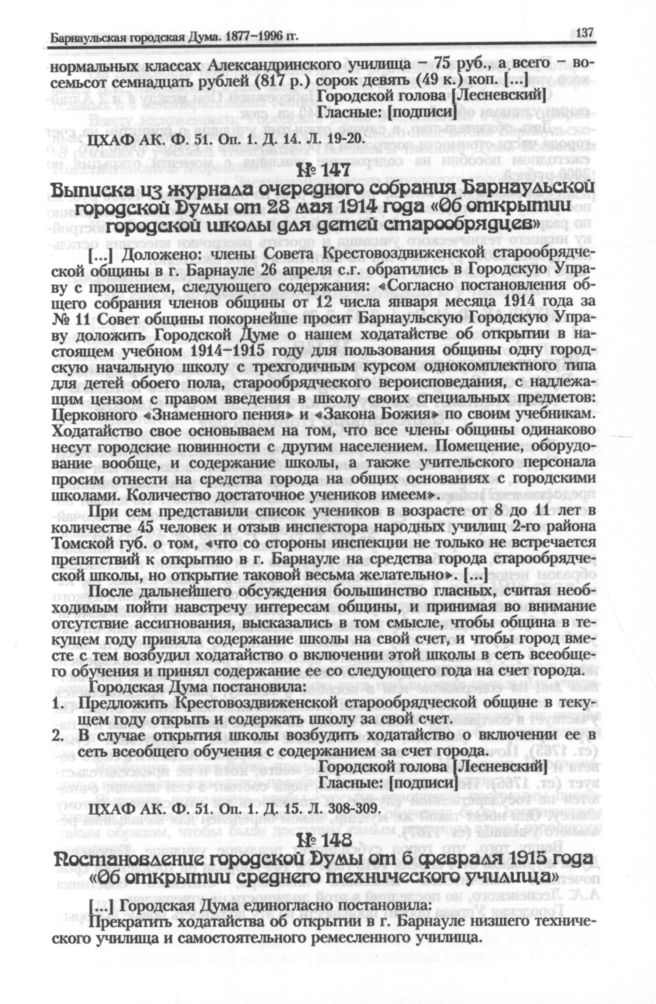 Выписка из журнала очередного собрания Барнаульской городской Думы от 28 мая 1914 года «Об открытии городской школы для детей старообрядцев» // ЦХАФ АК. Ф. 51. Oп. 1. Д. 15. Л. 308-309.