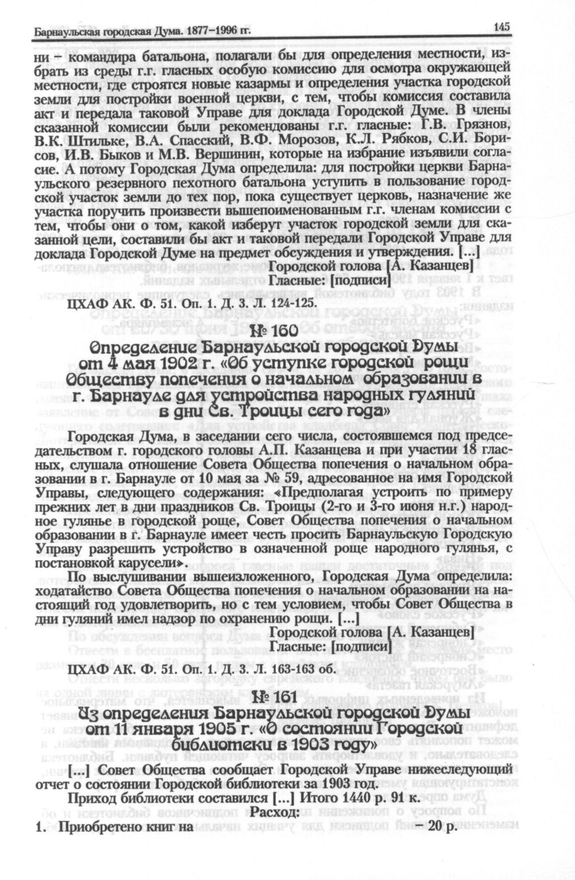 Определение Барнаульской городской Думы от 4 мая 1902 г. «Об уступке городской рощи Обществу попечения о начальном образовании в г. Барнауле для устройства народных гуляний в дни Св. Троицы сего года» // ЦХАФ АК. Ф. 51. Oп. 1. Д. 3. Л. 163-163 об.