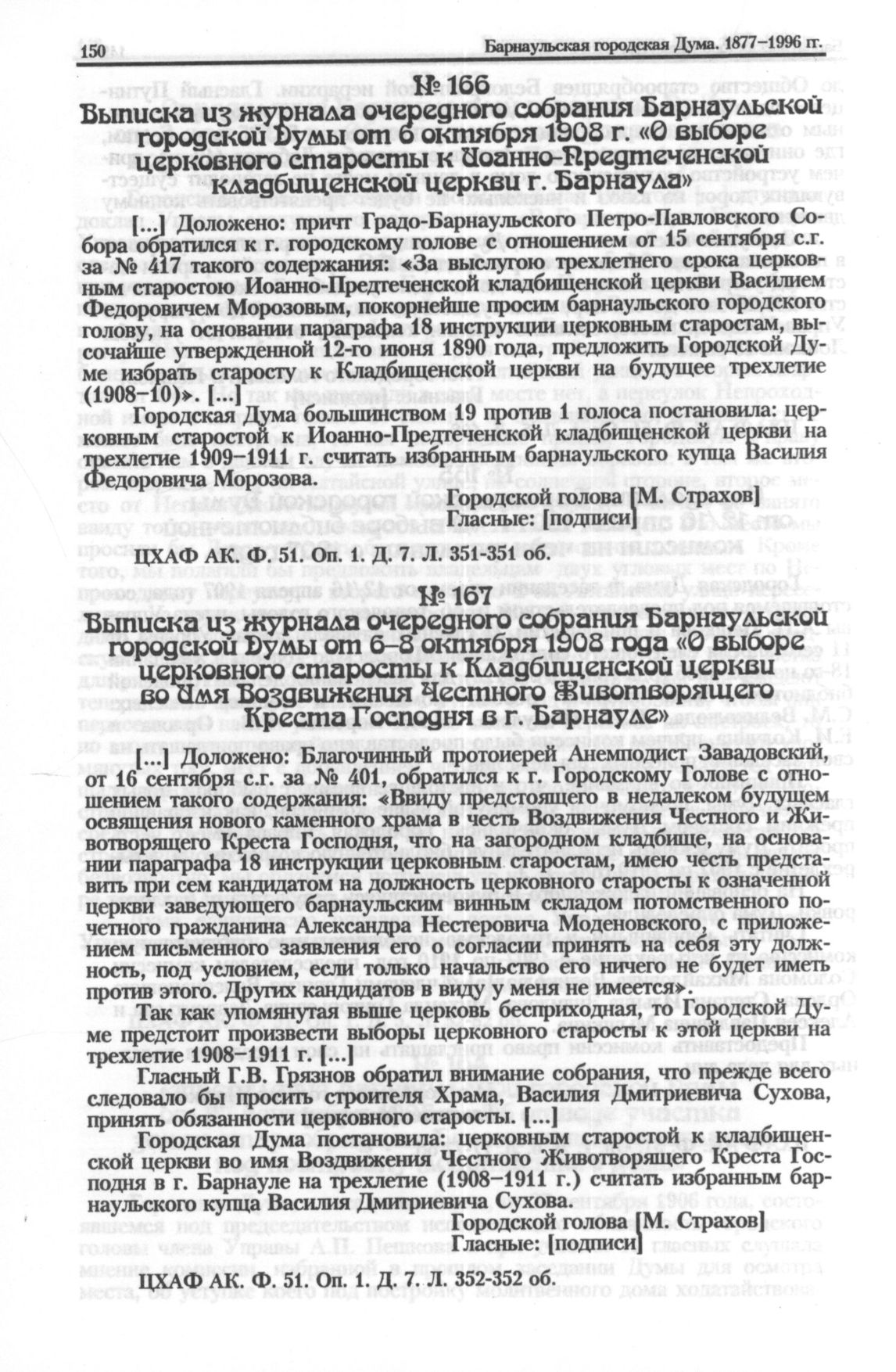 Быписка из журнала очередного собрания Барнаульской городской Думы от 6-8 октября 1902 года «О выборе церковного старосты к Кладбищенской церкви во имя Воздвижения Честного Животворящего Креста Господня в г. Барнауле» // ЦХАФ АК. Ф. 51. Oп. 1. Д. 7. Л. 352-352 об.