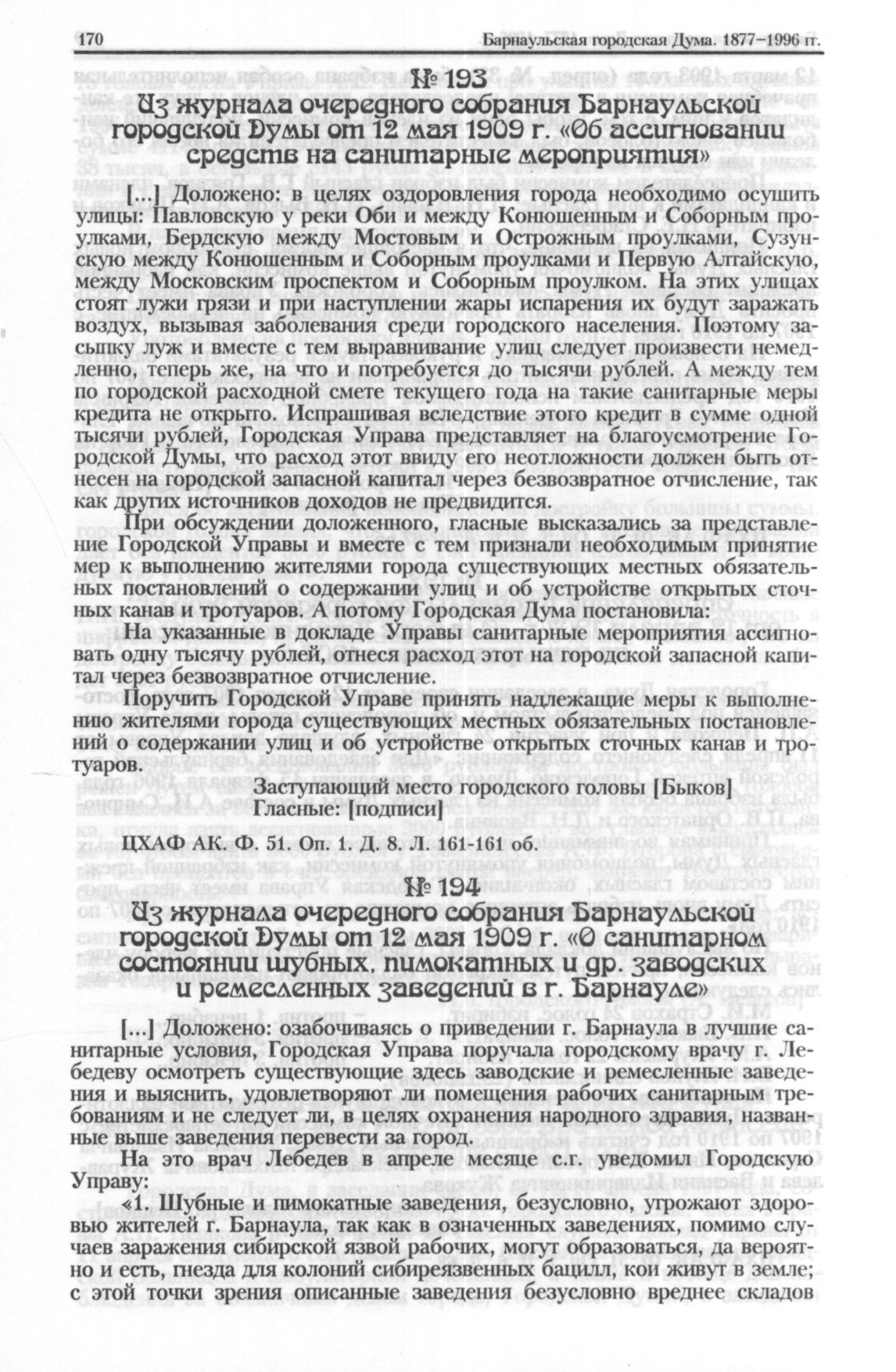 Из журнала очередного собрания Барнаульской городской Дyмы от 12 мая 1909 г. «О санитарном состоянии шубных, пимокатных и др. заводских и ремесленных заведений в г. Барнауле» // ЦХАФ АК. Ф. 51. Оп. 1. Д. 8. Л. 174-176.