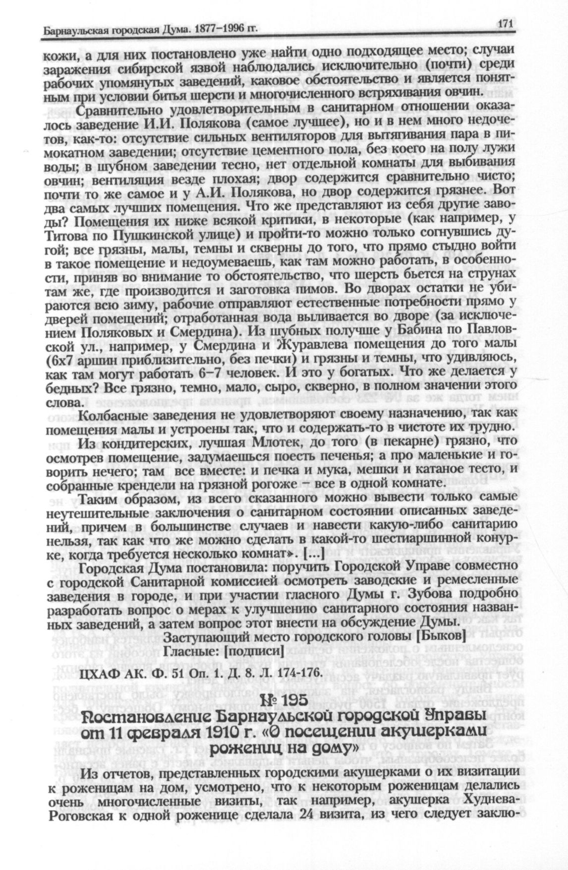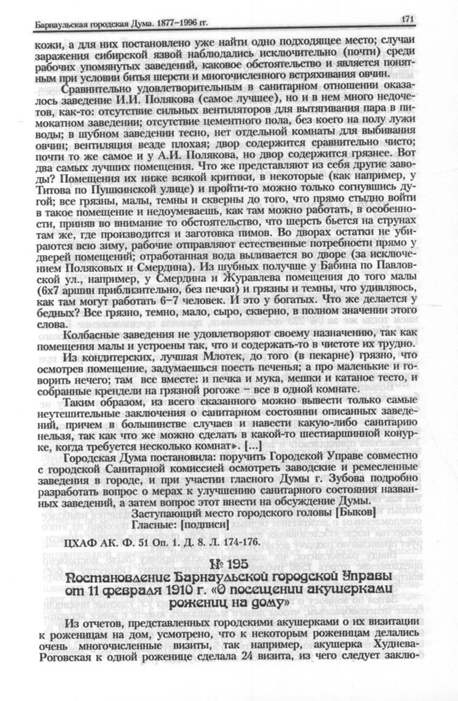 Постановление Барнаульской городской Управы от 11 февраля 1910 г. «О посещении акушерками рожениц на дому» // ЦХАФ АК. Ф. 219. Oп. 1. Д. 11. Л. 35.