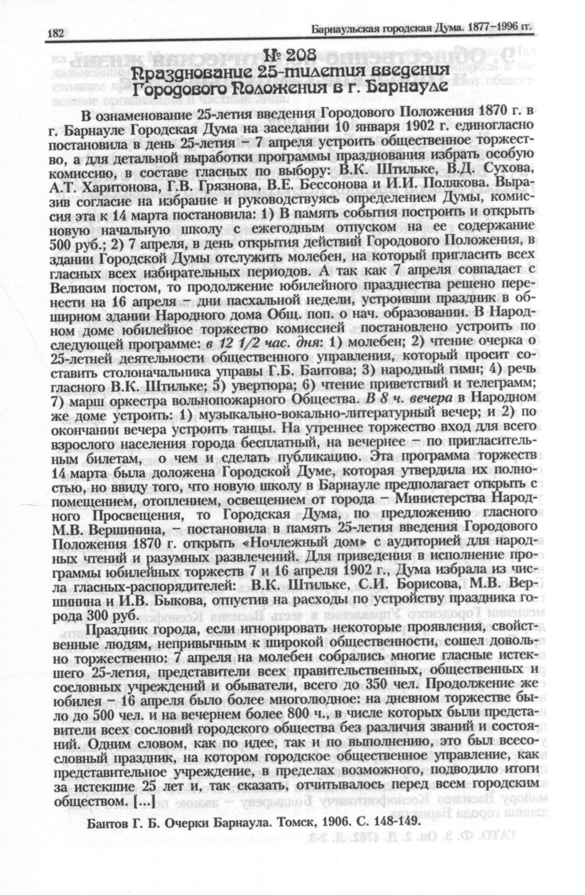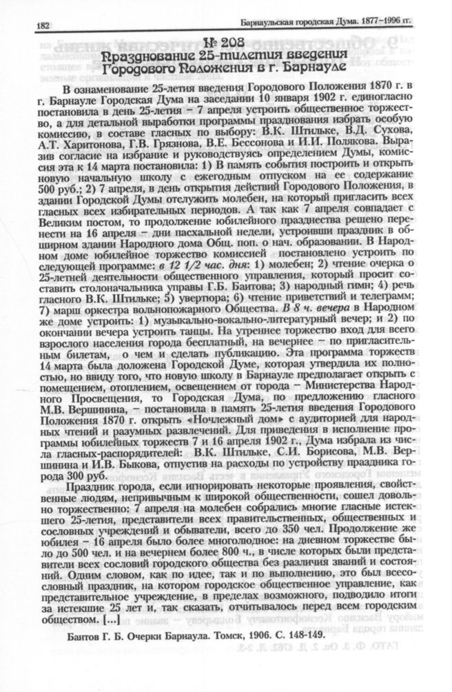 Празднование 25-тилетия введения Городового Положения в г. Барнауле // Баитов Г. Б. Очерки Барнаула. Томск, 1906. С. 148-149.