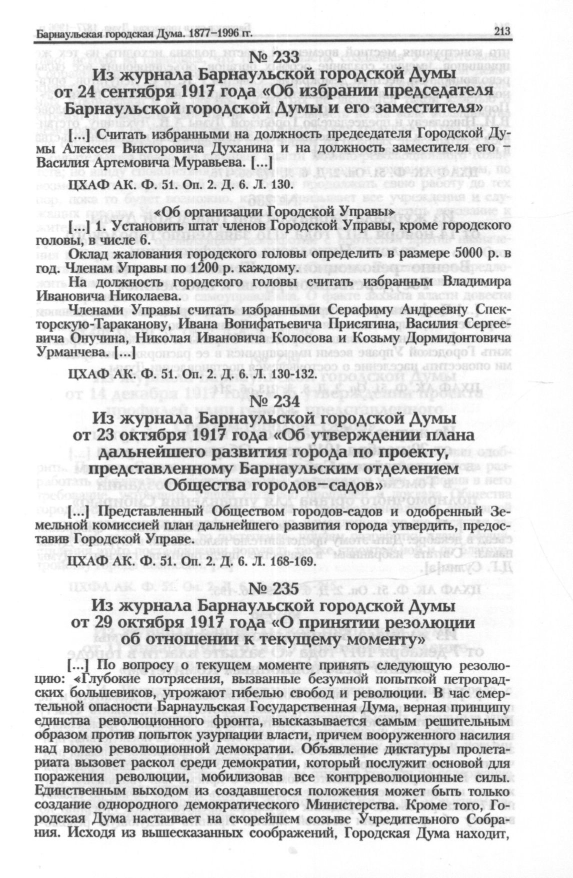 Из журнала Барнаульской городской Думы от 23 октября 1917 года «Об утверждении плана дальнейшего развития города по проекту, представленному Барнаульским отделением Общества городов-садов» // ЦХАФ АК. Ф. 51. Оп. 2. Д. 6. Л. 168-169.