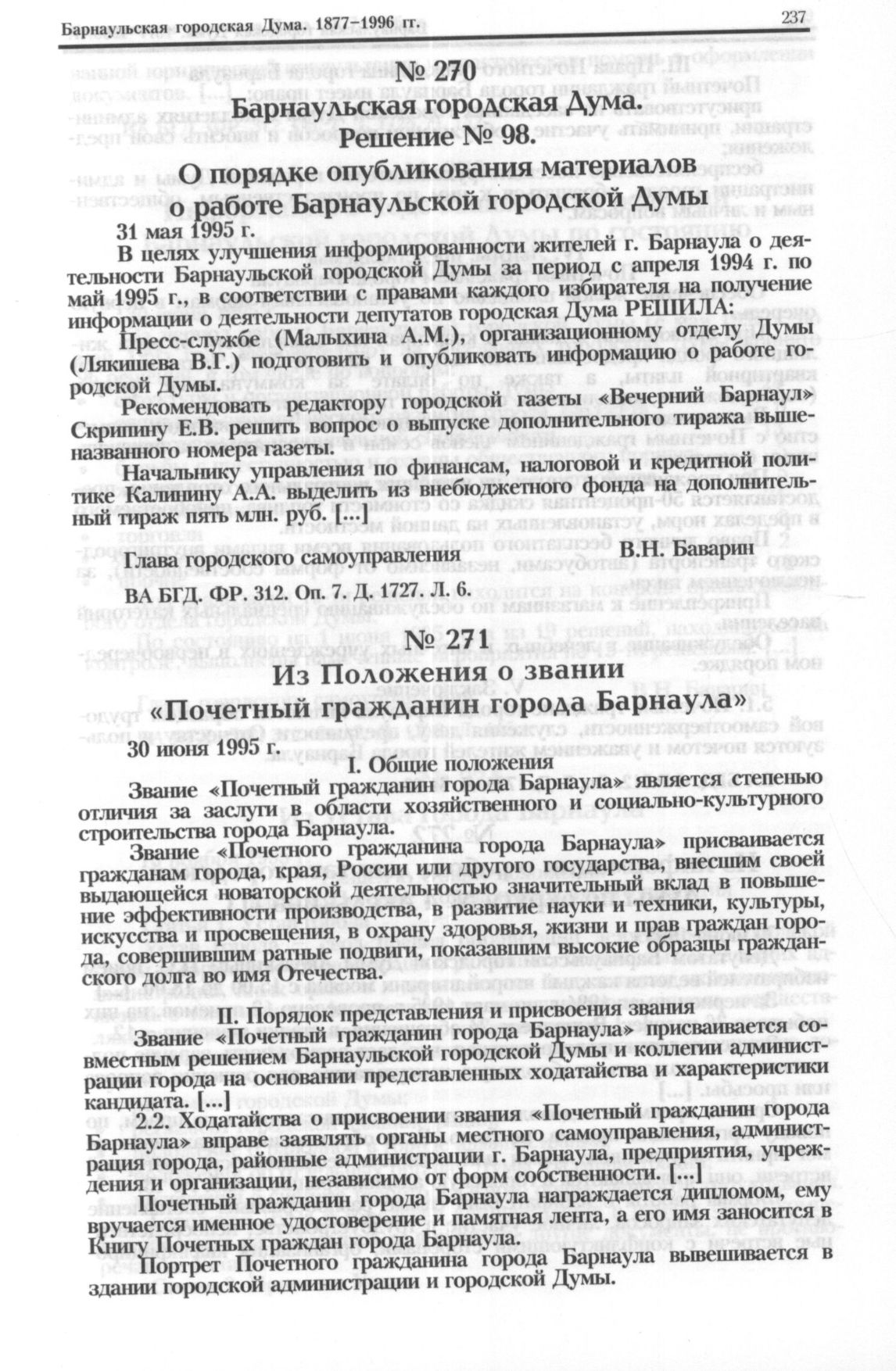 Из Положения о звании «Почетный гражданин города Барнаула». 30 июня 1995 г. // ВА БГД. ФР. 312. Оп. 7. Д. 1728. Л. 61-63.