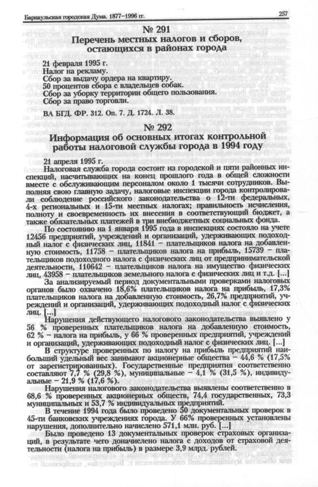 Информация об основных итогах контрольной работы налоговой службы города в 1994 году. 21 апреля 1995 г. // ВА БГД. ФР. 312. Оп. 7. Д. 1726. Л. 84, 85, 87, 88, 90.