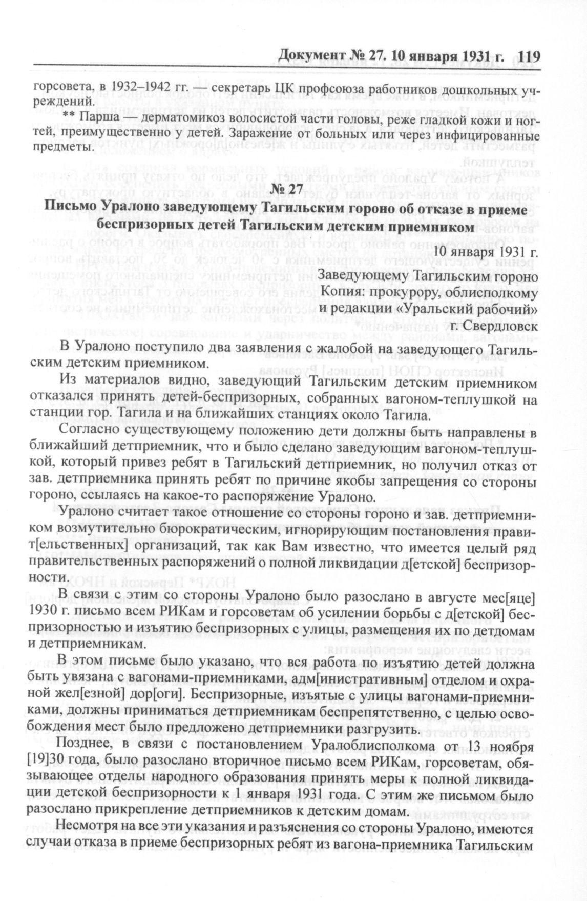 Письмо Уралоно заведующему Тагильским гороно об отказе в приеме беспризорных детей Тагильским детским приемником. 10 января 1931 г. // ГАСО. Ф. р-321. Oп. 1. Д. 15. Л. 3, 3 об. Машинопись. Подлинник.