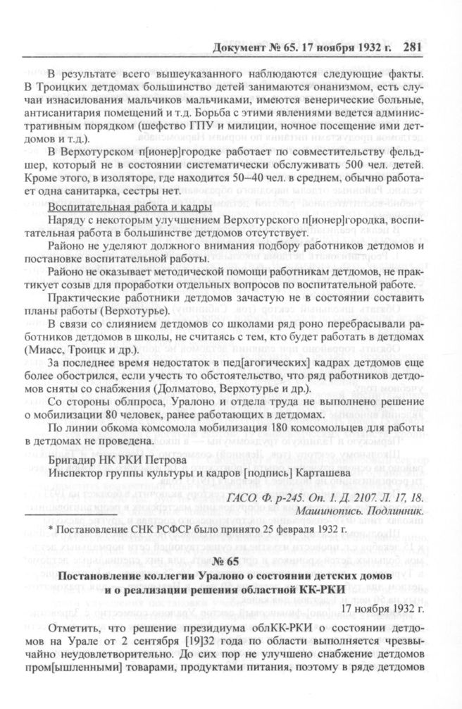 Постановление коллегии Уралоно о состоянии детских домов и о реализации решения областной КК-РКИ. 17 ноября 1932 г. // ГАСО. Ф. р-245. Oп. 1. Д. 2106. Л. 62, 62 об., 63. Машинопись. Копия.