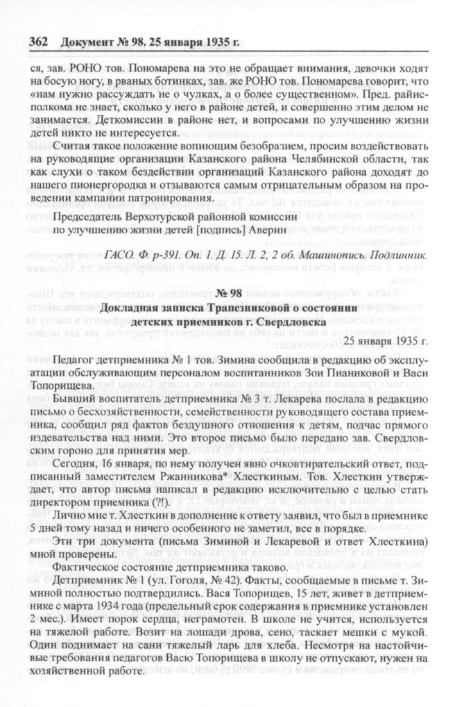 Докладная записка Трапезниковой о состоянии детских приемников г. Свердловска. 25 января 1935 г. // ЦДООСО. Ф. 4. Oп. 13. Д. 437. Л. 139-142. Машинопись. Подлинник.