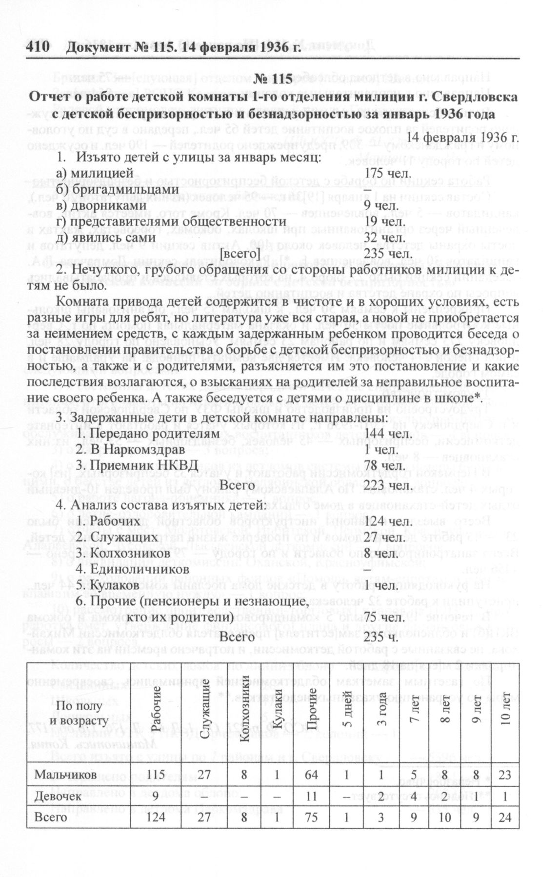 Отчет о работе детской комнаты 1-го отделения милиции г. Свердловска с детской беспризорностью и безнадзорностью за январь 1936 года. 14 февраля 1936 г. // ГАСО. Ф. р-321. Oп. 1. Д. 73. Л. 51, 52. Машинопись. Подлинник.