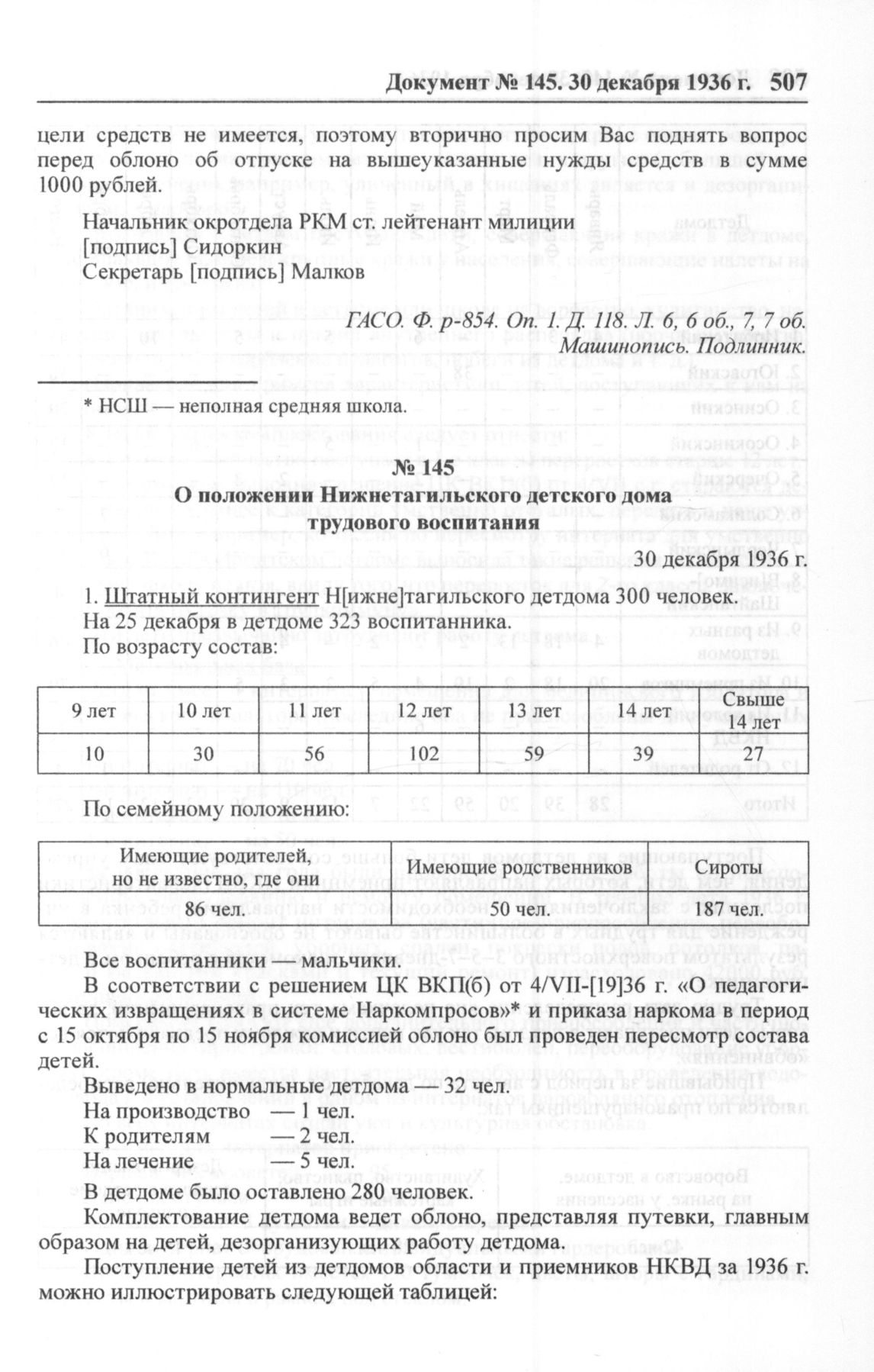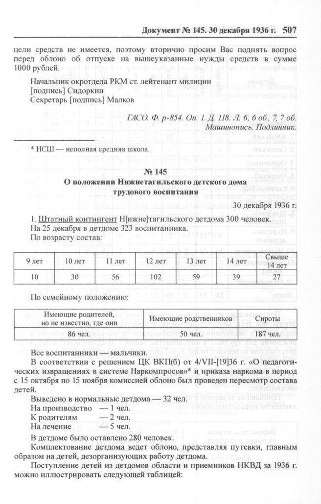 О положении Нижнетагильского детского дома трудового воспитания. 30 декабря 1936 г. // ЦДООСО. Ф. 4. Oп. 14. Д. 412. Л. 188-205. Машинопись. Копия.