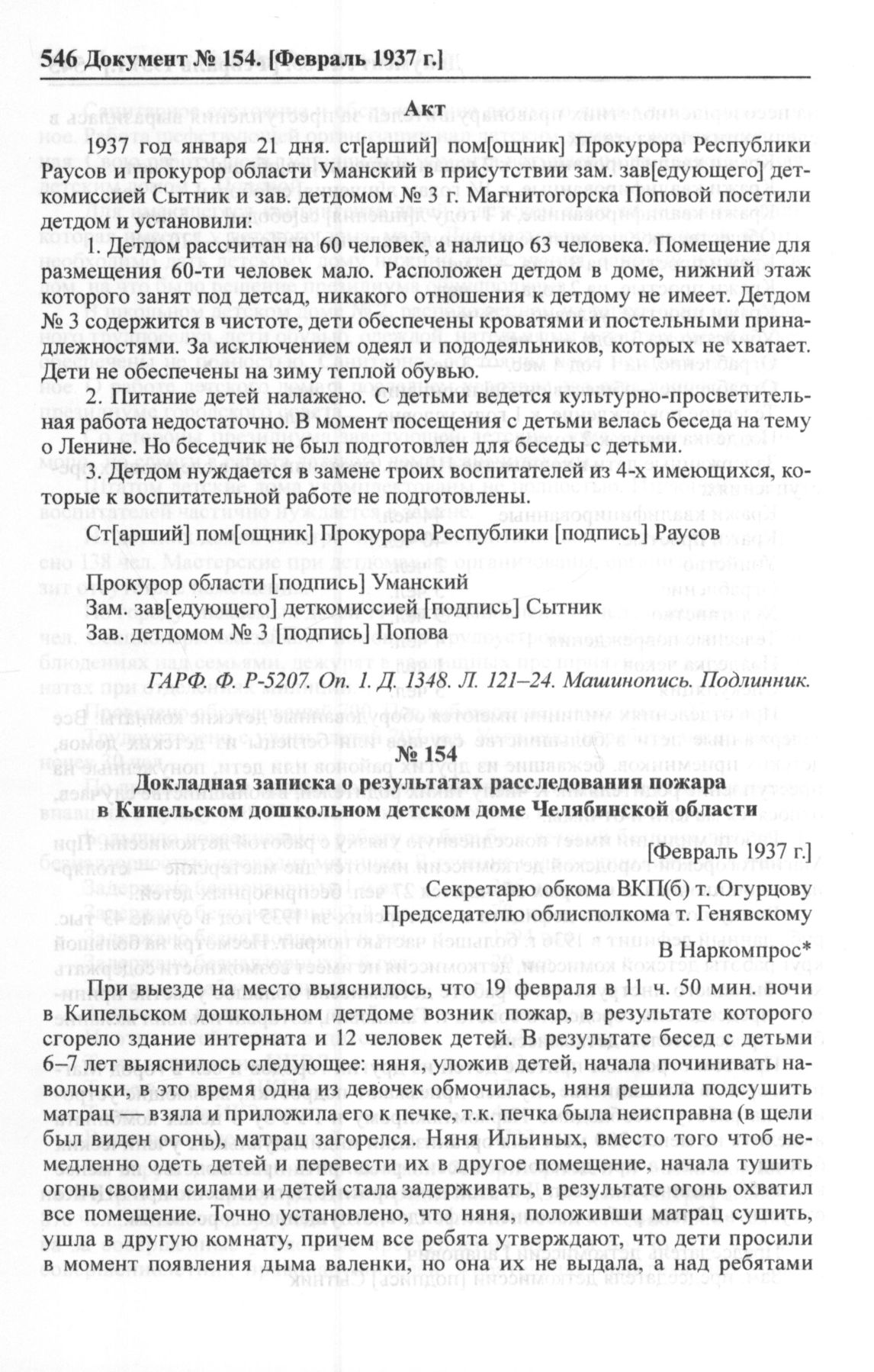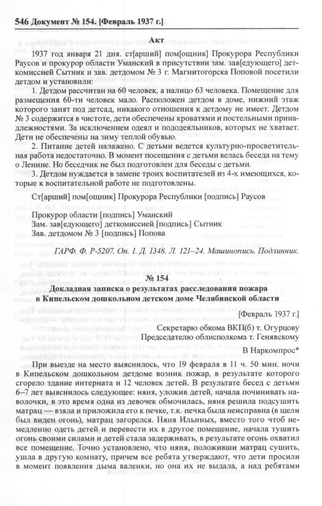 Докладная записка о результатах расследования пожара в Кипельском дошкольном детском доме Челябинской области. [Февраль 1937 г.] // ОГАЧО. Ф. р-1000. Oп. 1. Д. 357. Л. 257, 257 об. Машинопись. Копия.