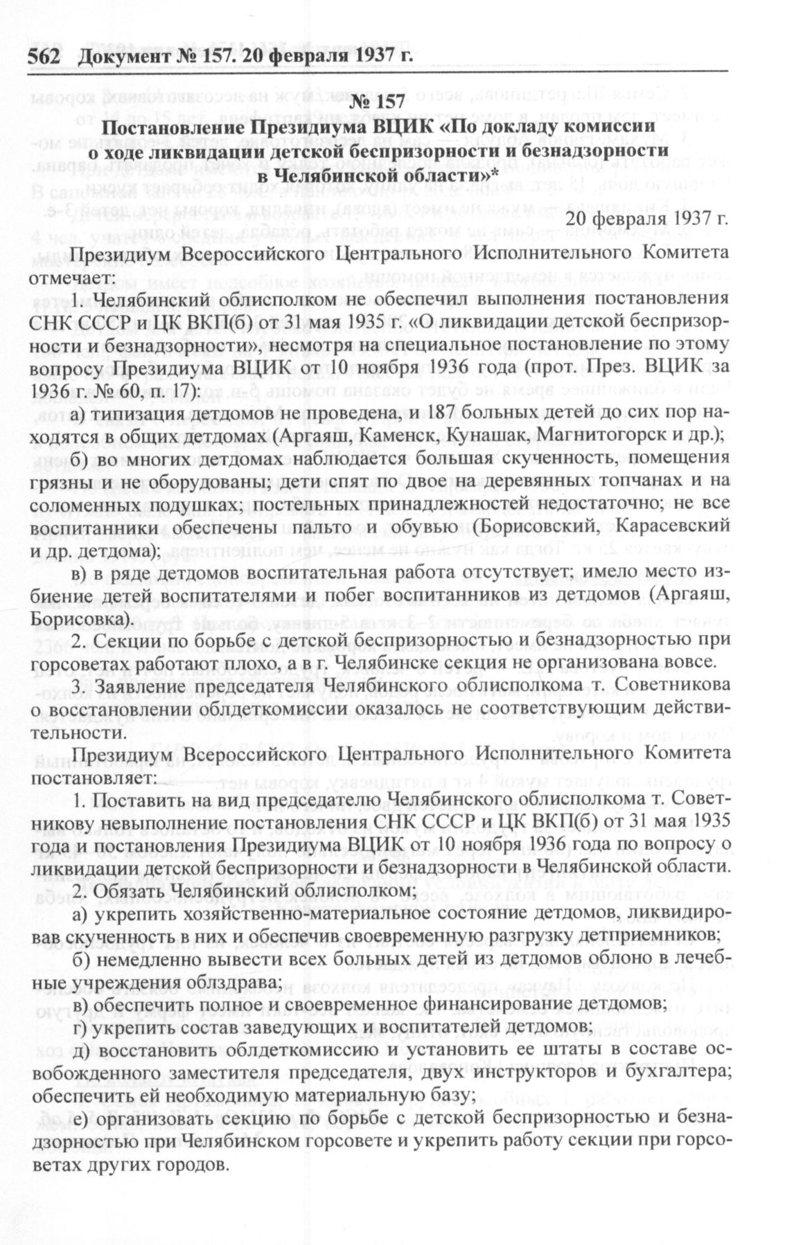 Постановление Президиума ВЦИК «По докладу комиссии о ходе ликвидации детской беспризорности и безнадзорности в Челябинской области». 20 февраля 1937 г. // ГАРФ. Ф. P-5207. Oп. 1. Д. 1618. Л. 5, 5 об. Машинопись. Заверенная копия.